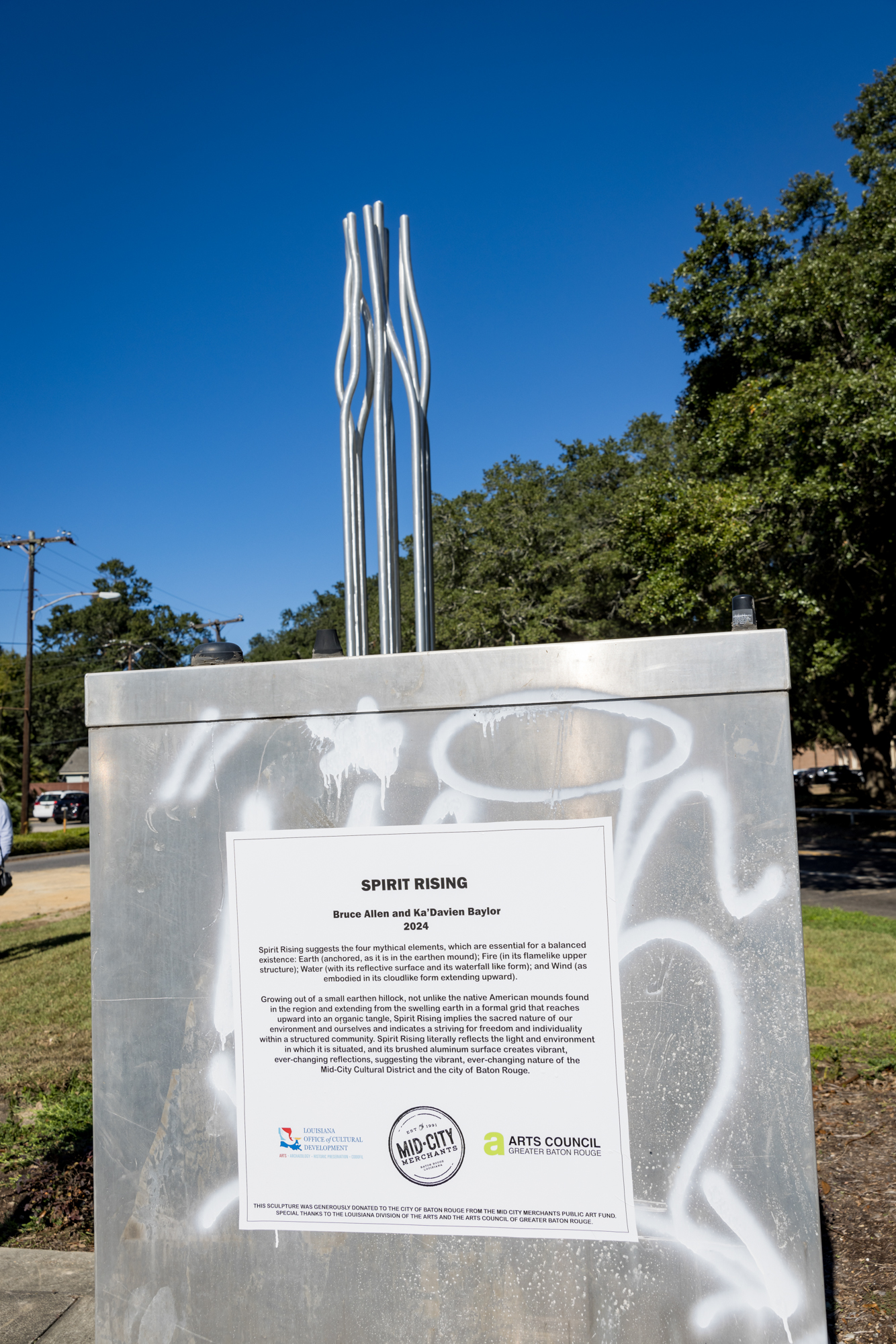 Located on a small green between Boudreaux’s Catering and Baton Rouge Magnet High School, the 20-foot-high aluminum sculpture was created by Shreveport artists Bruce Allen and KaDavien Baylor. Entitled “Spirit Rising,” it’s intended to evoke the four elements: earth, wind, fire and water. The piece features nine rods organized in a grid pattern that reach skyward, each bending in a slightly different fashion at the top.