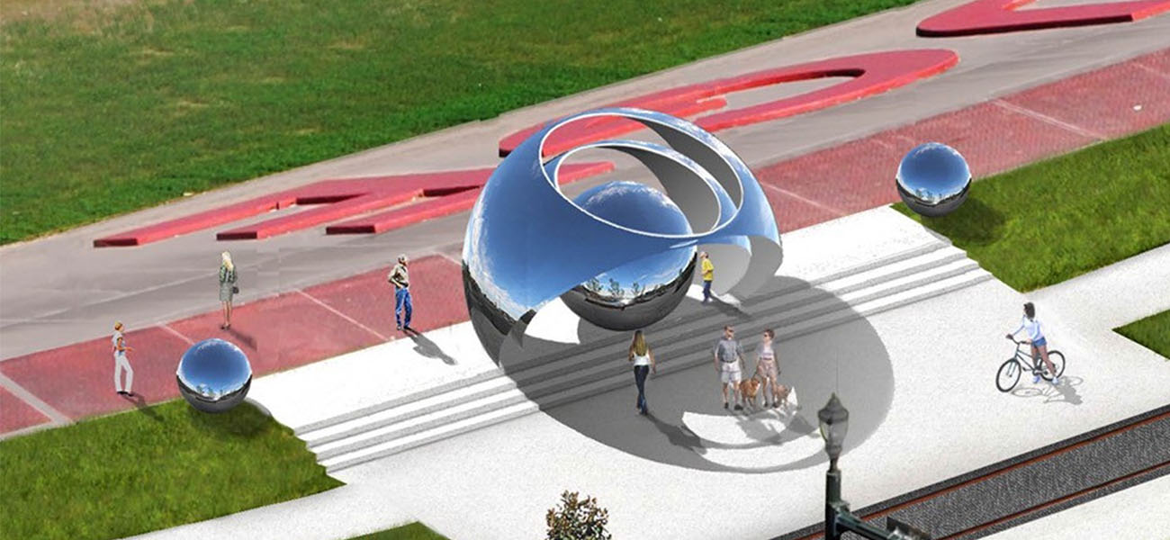 The multifaceted art piece will consist of one sphere in the center and two partial spheres surrounding it. The sculpture will be reflective—think “The Bean” in Chicago—and light up at night.