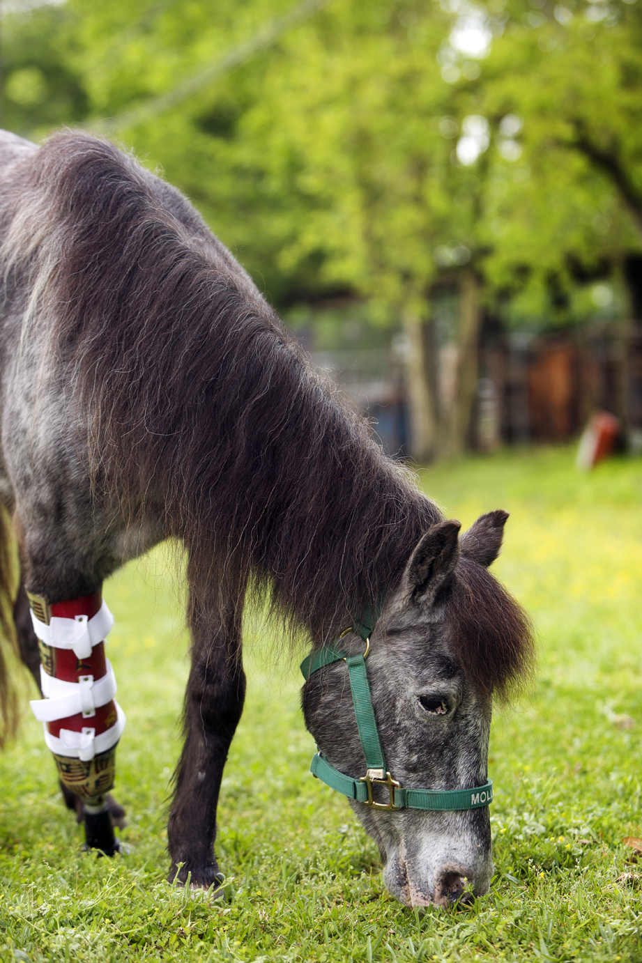 Molly survived, but while her other legs healed, her front right leg had no circulation and was too severely damaged for her to use. Harris recalls hearing and feeling a horrendous snap while doing recovery therapy with Molly one day. Molly’s hoof bone had fractured.