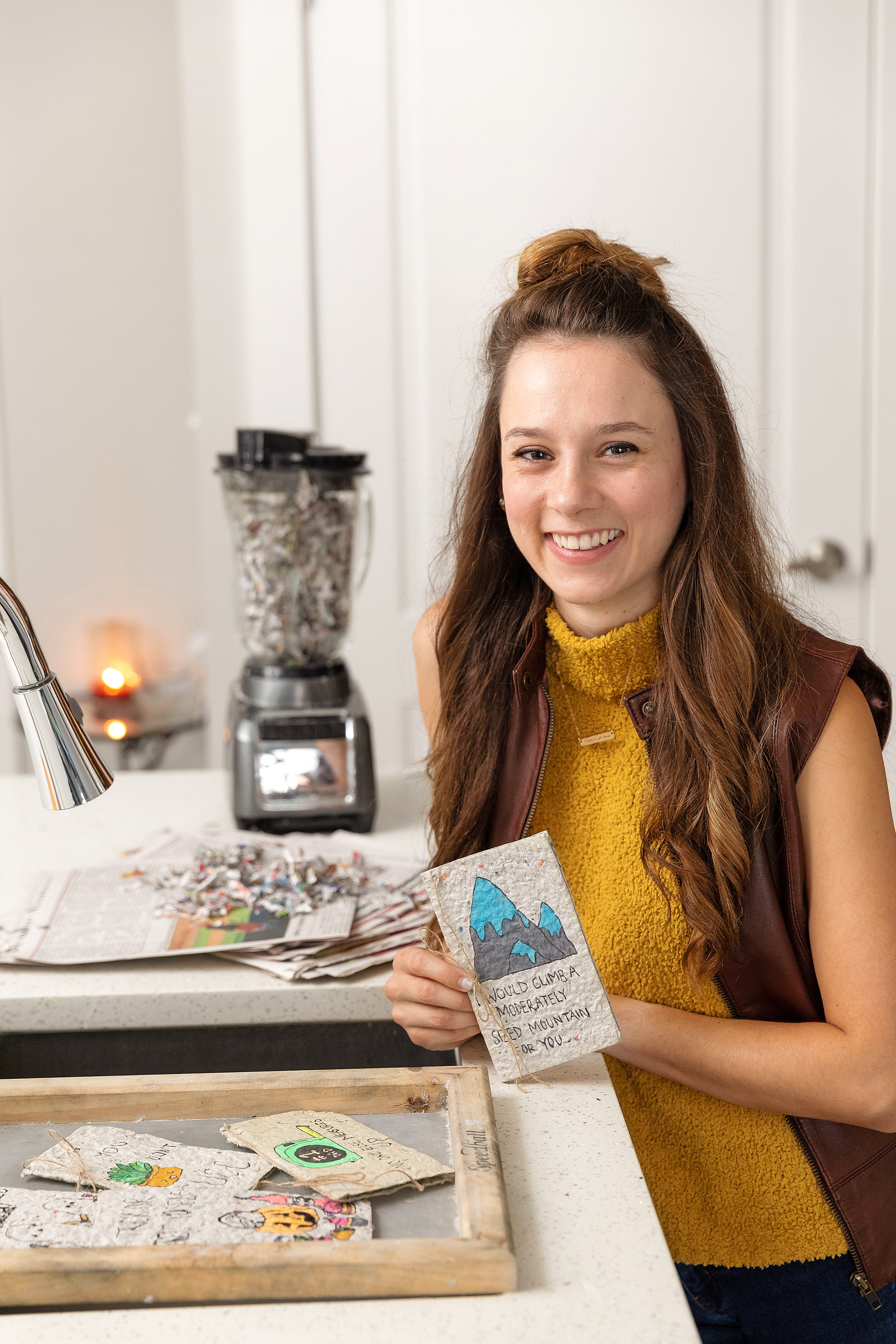That process takes patience. After working her full-time job at Dow, the 23-year-old spends her evenings prepping recycled newspaper and crafting the cards. To make the paper, she repurposes old newspapers that she collected from her former job at The Gonzales Weekly Citizen and Donaldsonville Chief. She shreds them and blends that material with water using her kitchen blender. She pours the mixture onto a screen print board, where it dries and forms a thick sheet of cardstock.
