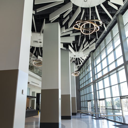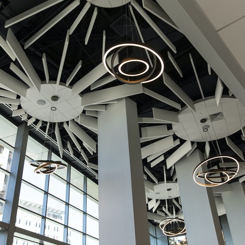 “Eric Marshall, our executive director at the Baton Rouge Symphony, was a professional opera singer and very much understands music,” says Caty Steward, BRSO’s director of patron engagement who led tours of the new theater and lobby on March 10 ahead of the orchestra’s first performance in the renovated space, “Julian Kuerti Conducts Dvořák.” “Those of us who don’t understand the science will just think the music sounds pretty, but the acoustics here were designed to trap the sound and bounce it back so it doesn’t go all the way up to the ceiling, instead pushing it out toward the audience. The theater was specifically designed to help balance the acoustics in the space.”