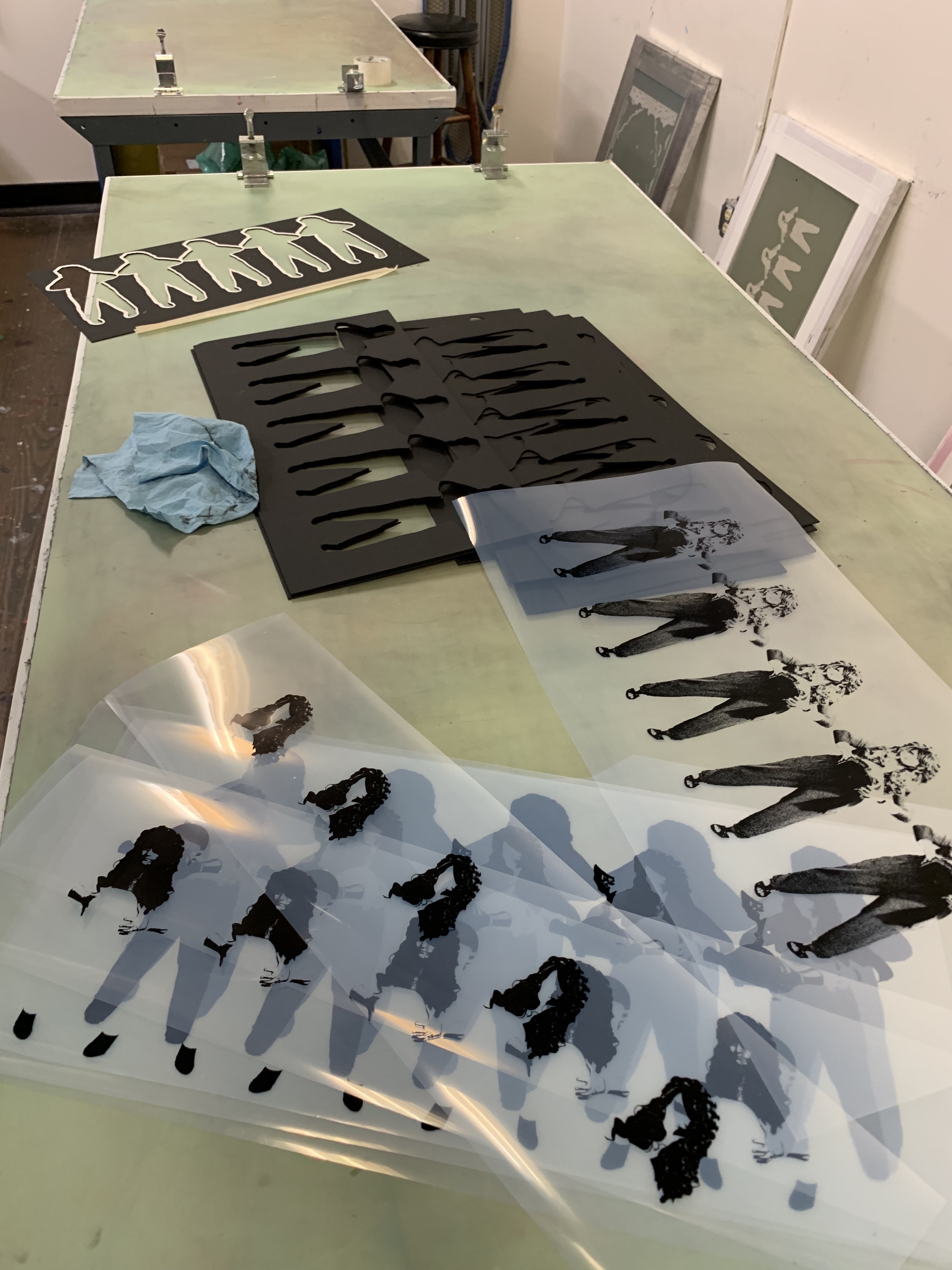 Right now, Friedman is constructing paper dolls based on a real-life depiction of one of her biker gang characters. She’s tinkering with a laser cutter and silkscreened images in the printmaking studio, trying to determine the material that works best, getting the color just right on the red wig and the bright pink helmet. Scattered across a table are dozens of these experiments, with the images printed on book board and then cut out, or in multiples on transparent sheets.