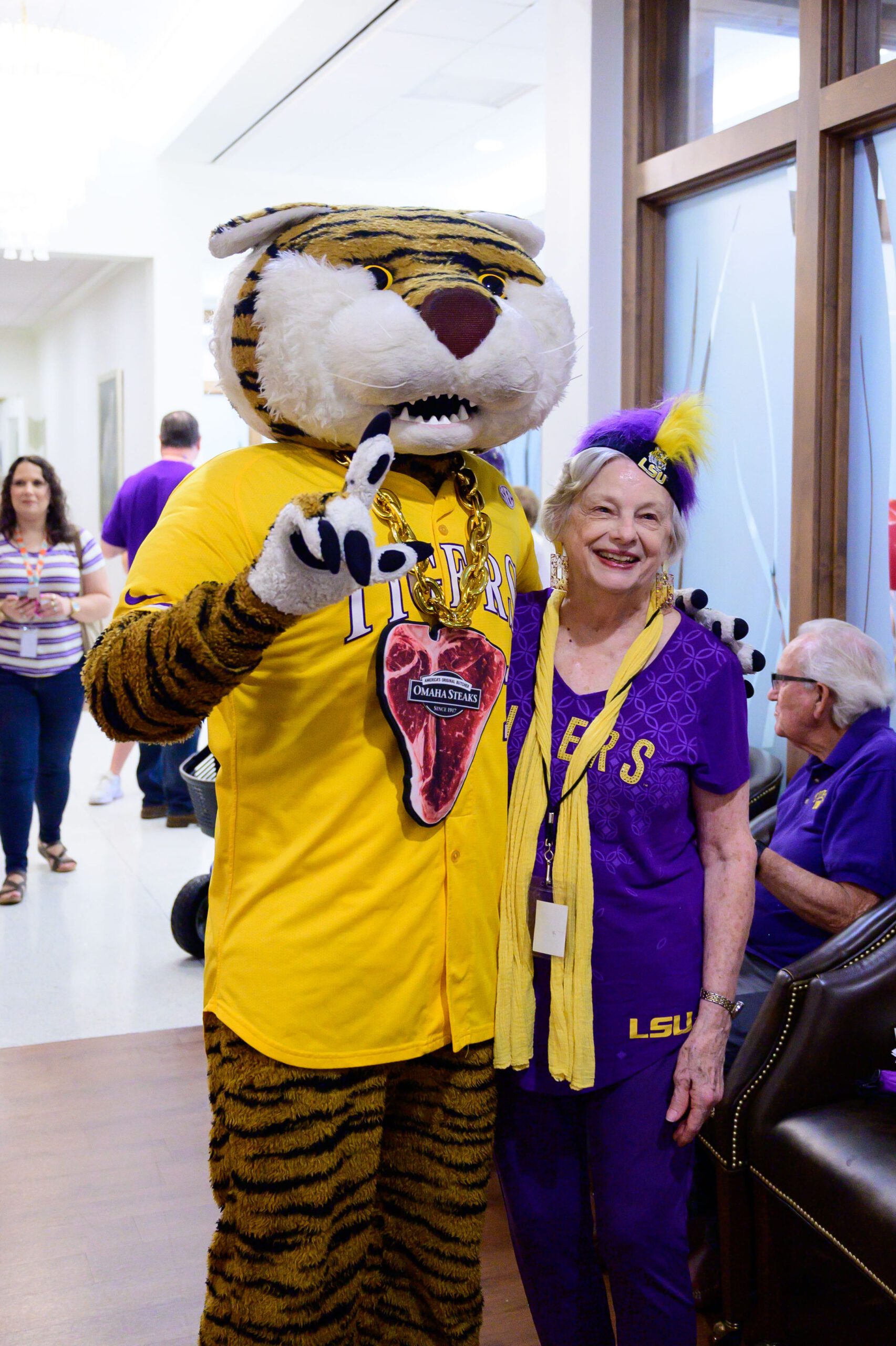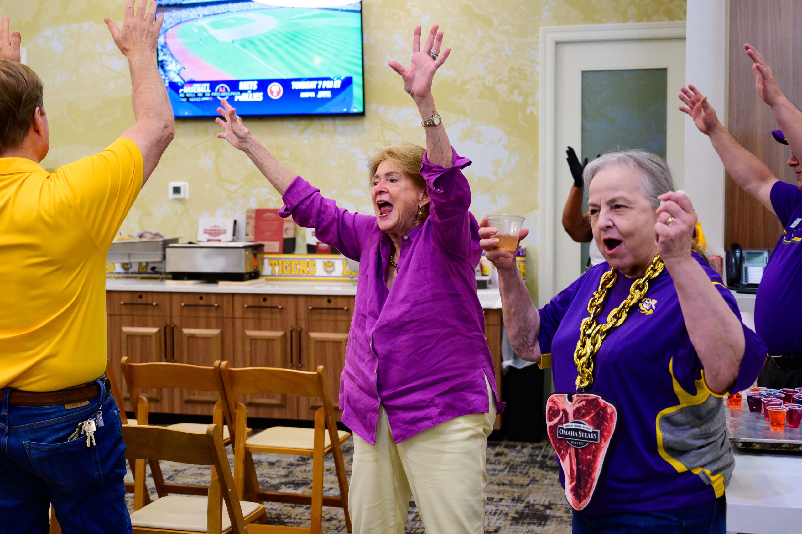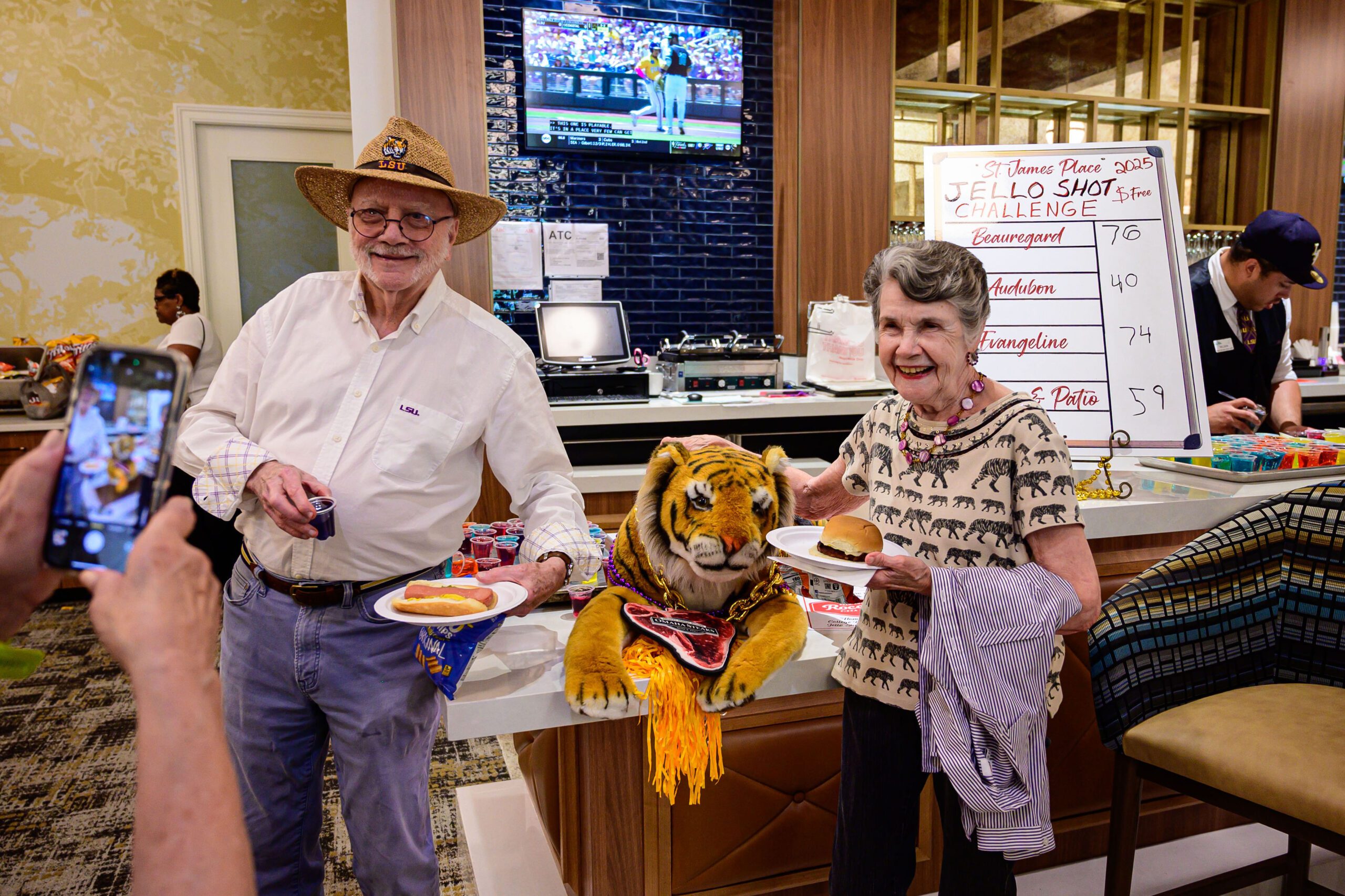While LSU fans in Omaha got to experience the College World Series in person, the residents of St. James Place got a taste of the championship back here in Baton Rouge–literally. And although the watch party officially started at 1:30 p.m., residents were already anxiously lining up to get shots and the catered food at 1:15 p.m., resident and former LSU professor June Tuma says.