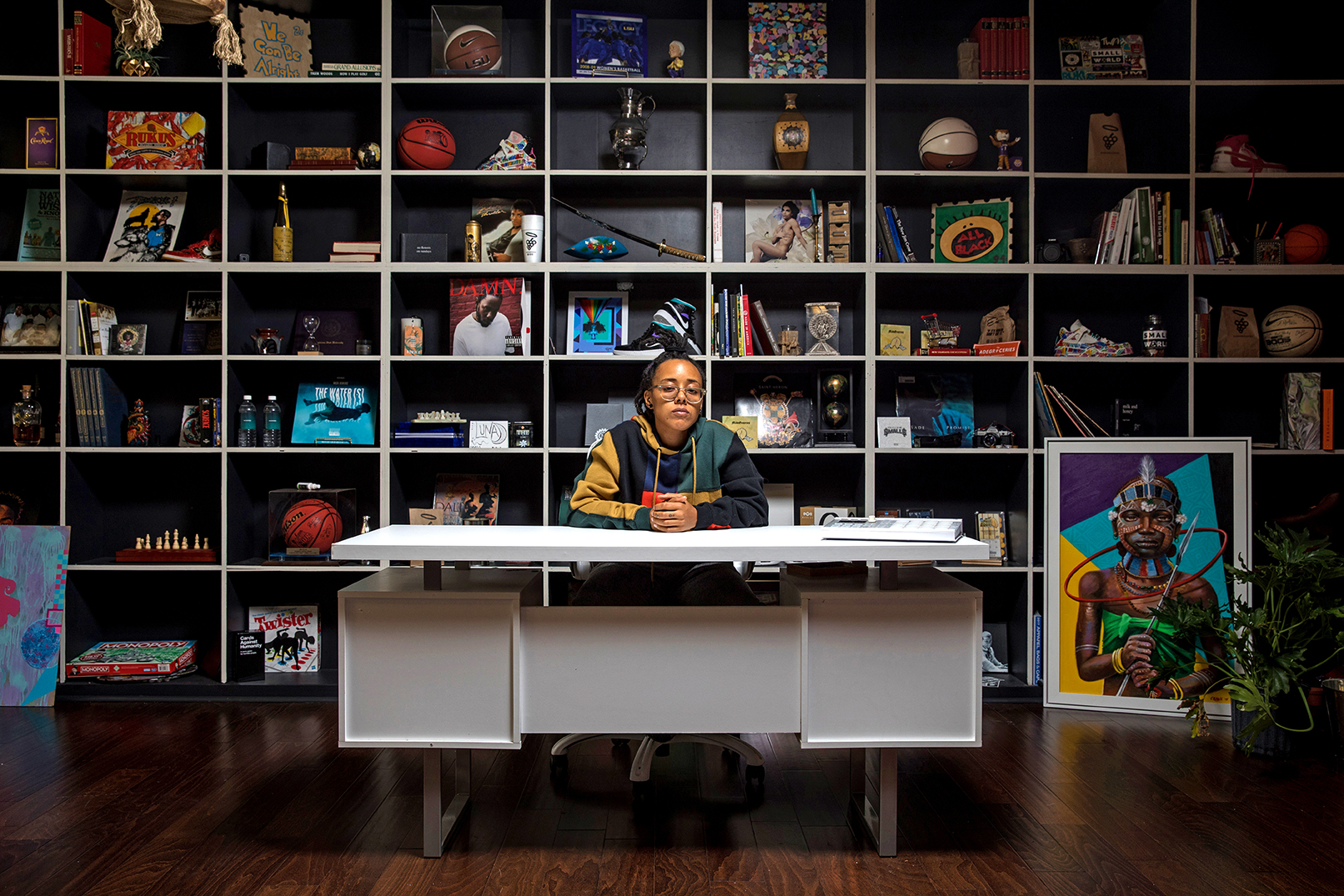 Unlike the traditional suit and tie you might expect from a music exec, Matthews is dressed today in Aztec printed joggers, a fanny pack, sneakers and a hoodie sporting the name of local band Made Groceries. Her laid-back, urban style is an accurate reflection of her business approach: Create your own blueprint.