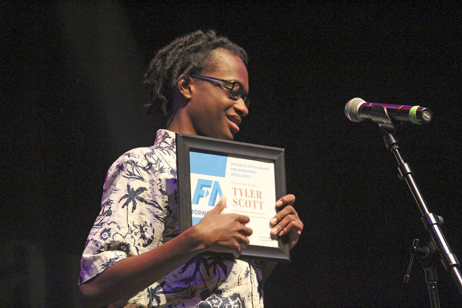 While we spoke to the youth poets at the Ebb & Flow Festival, these photos were taken during their performances at the All City Teen Poetry Slam finals April 8. At the finals, Smith, Sundiata and Morris earned spots on the 2017 Forward Arts All Stars slam team to compete at the Brave New Voices International Youth Poetry Slam Festival in San Francisco in July. Scott received the first-ever Kaiya Smith Award for WordCrew Excellence and an all-expense-paid trip to the Brave New Voices festival.