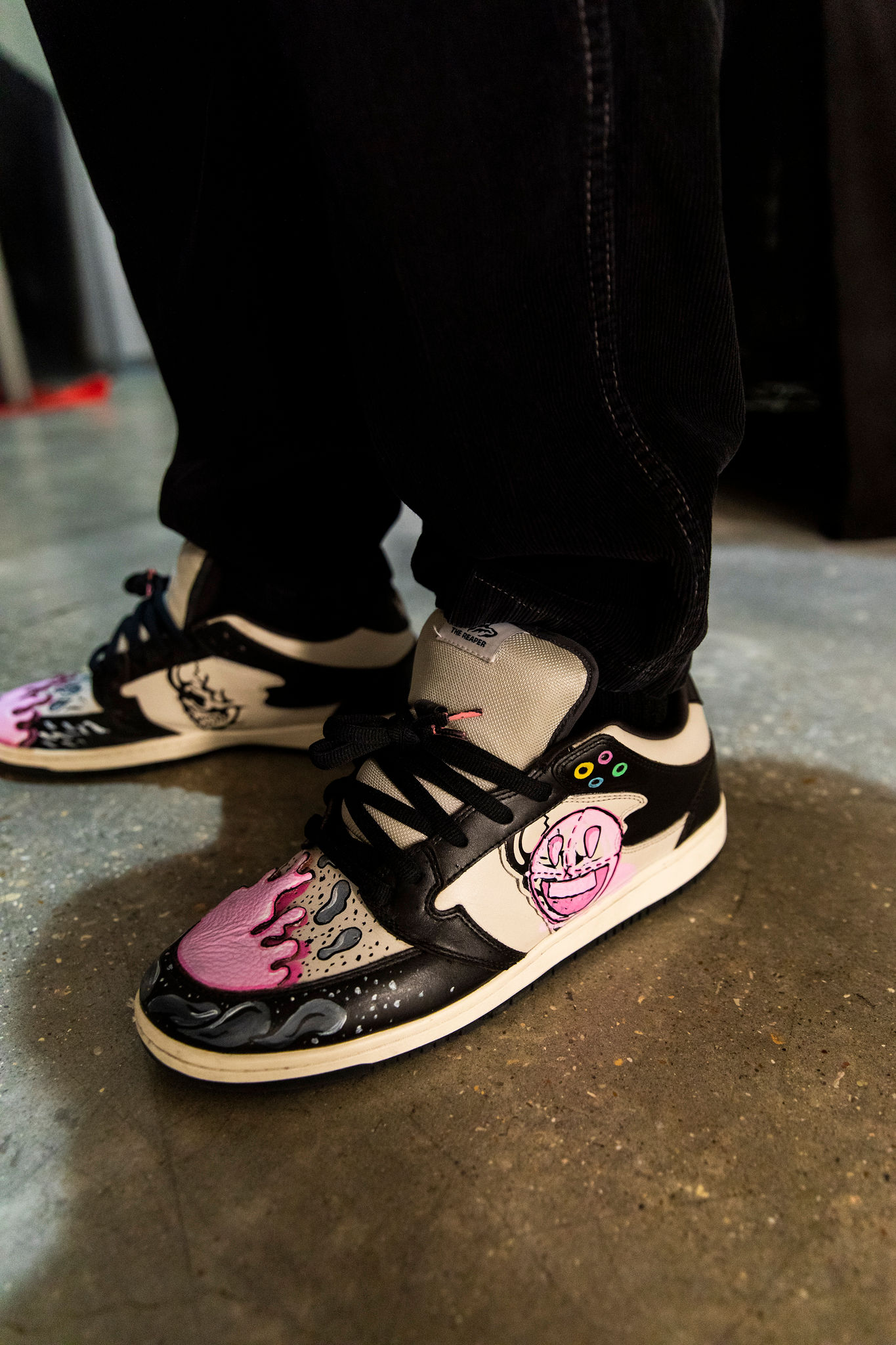 Coat from ASOS with custom graphics he painted himself; custom Nike Reaper Dunks by Los Angeles artist Warren Lora, worn out from skating and patched with his own designs. The rest was thrifted.