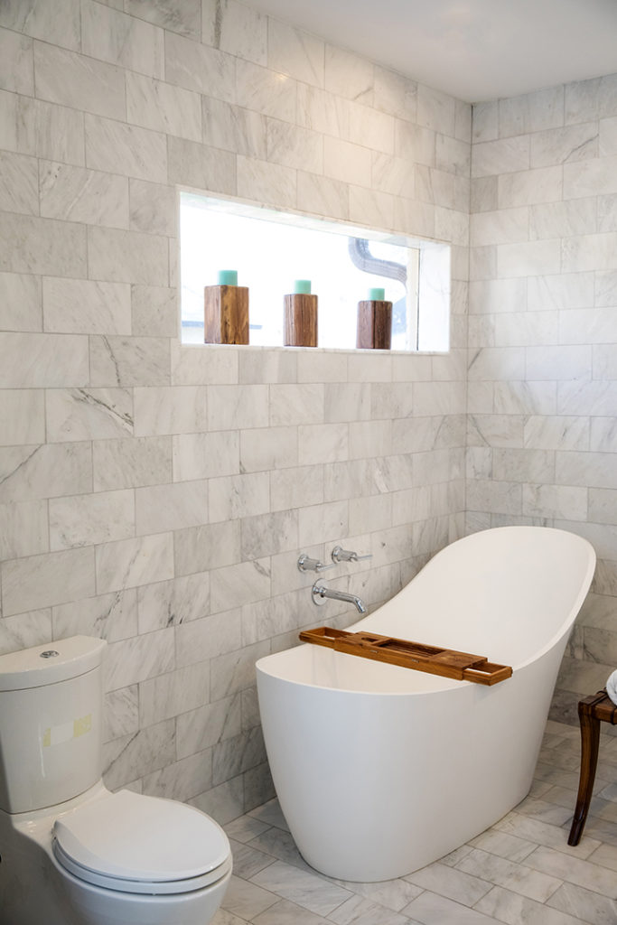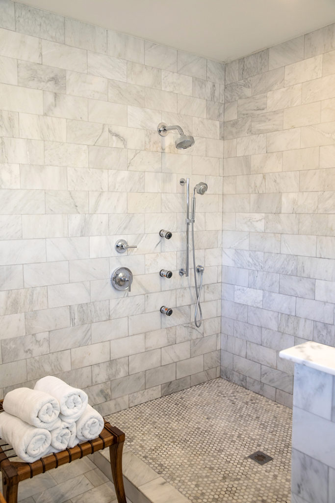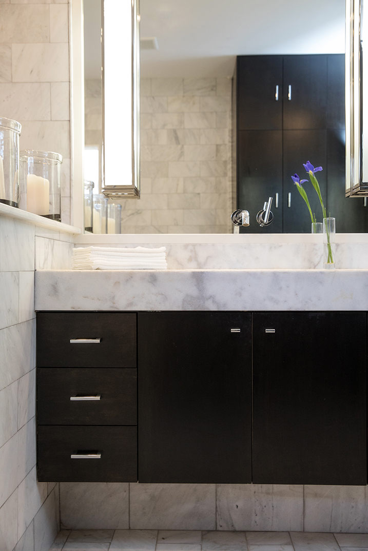 The floors, walls and counters were finished with white marble. Dark cabinetry warms the space. The result, Larkins says, feels like a boutique hotel.