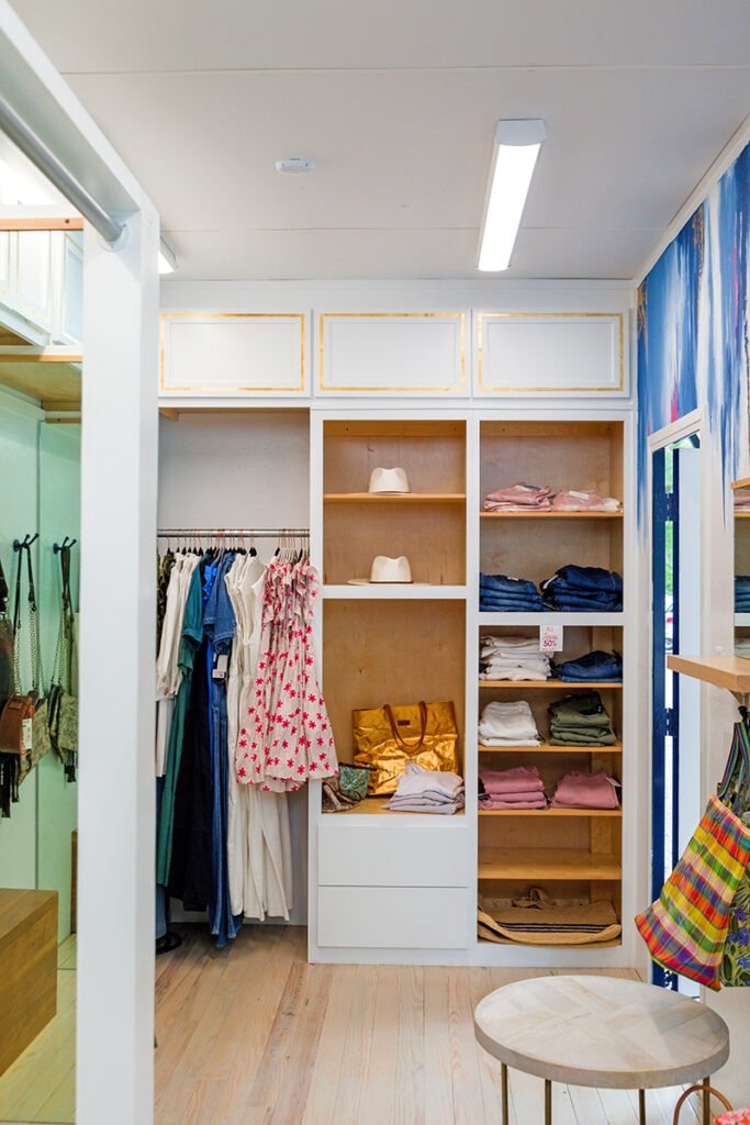 Like a well-organized walk-in closet, everything has its place. Dresses and blouses hang neatly from rose gold-capped velvet hangers. Hats and bags are perched on shelves. There’s even a private dressing room with a floor-to-ceiling mirror and a bench. Shoppers can try on dressy-casual shirts and dresses from brands like English Factory, THML, En Saison, AG Jeans and Articles of Society.