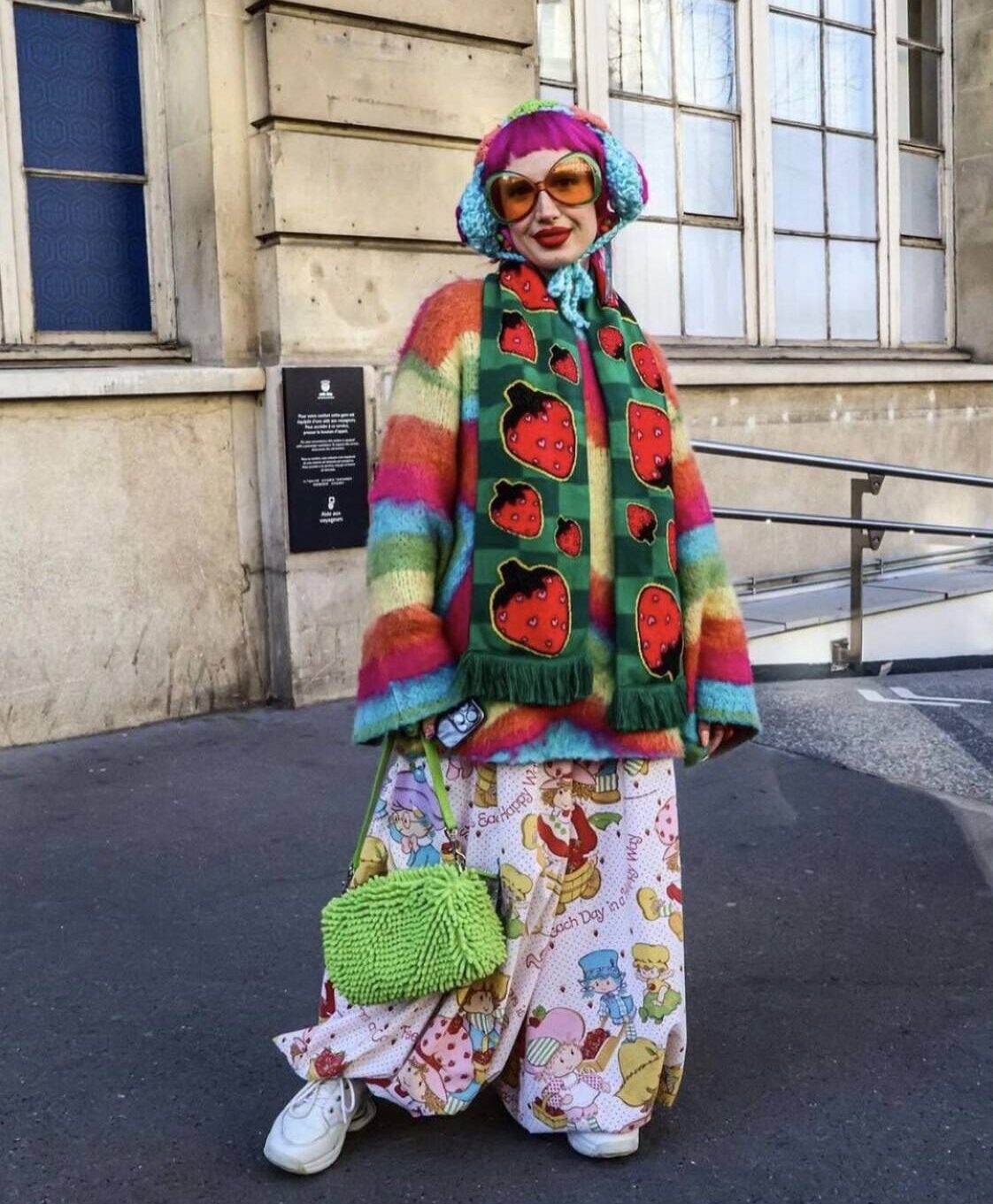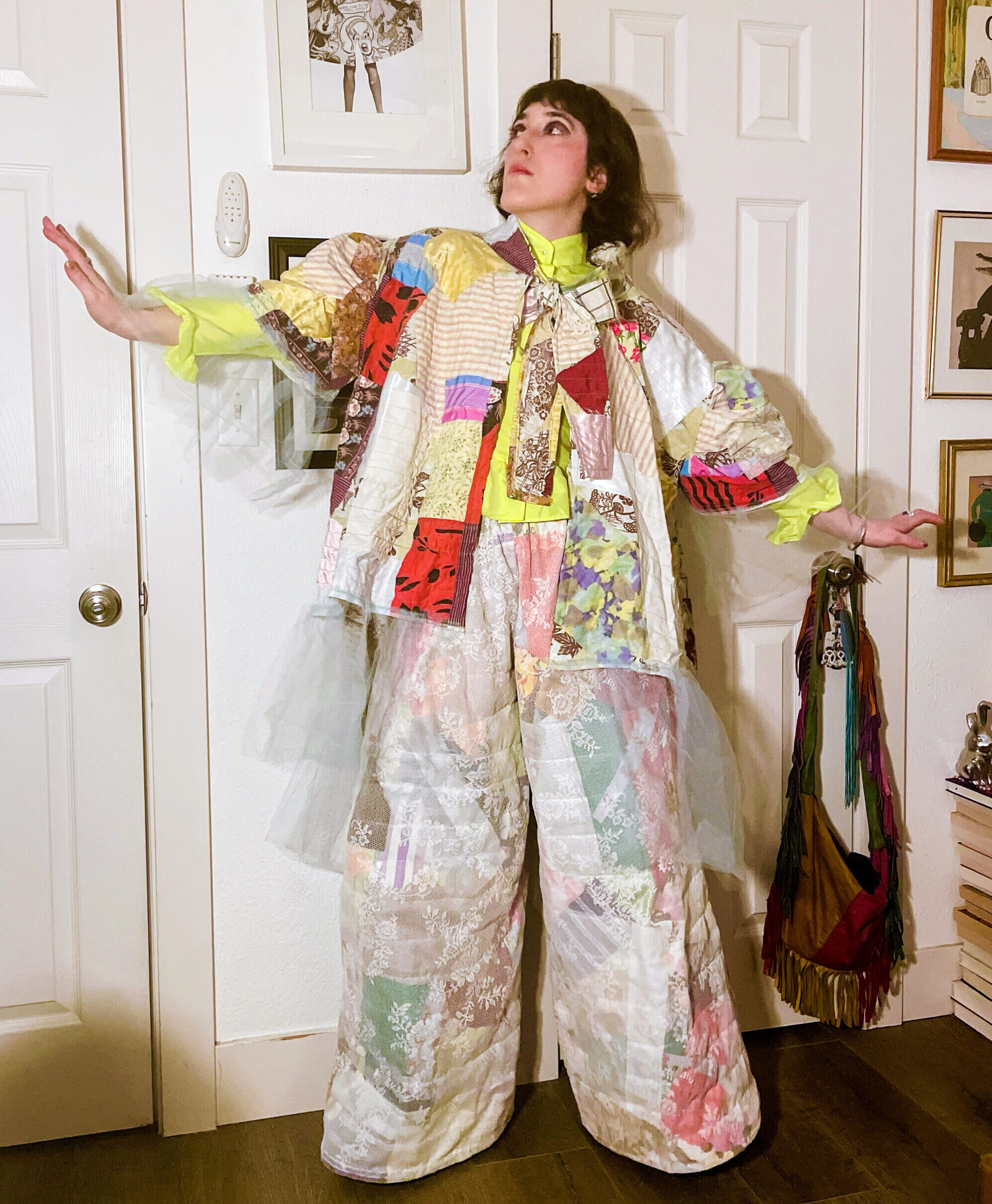 I made a puff-sleeve opera-style coat. It’s very voluminous, colorful and fun. It’s got layers of tulle on the bottom and on the sleeves, and a bow at the neck to close it. It took so much time to make, but that’s been my new favorite method.