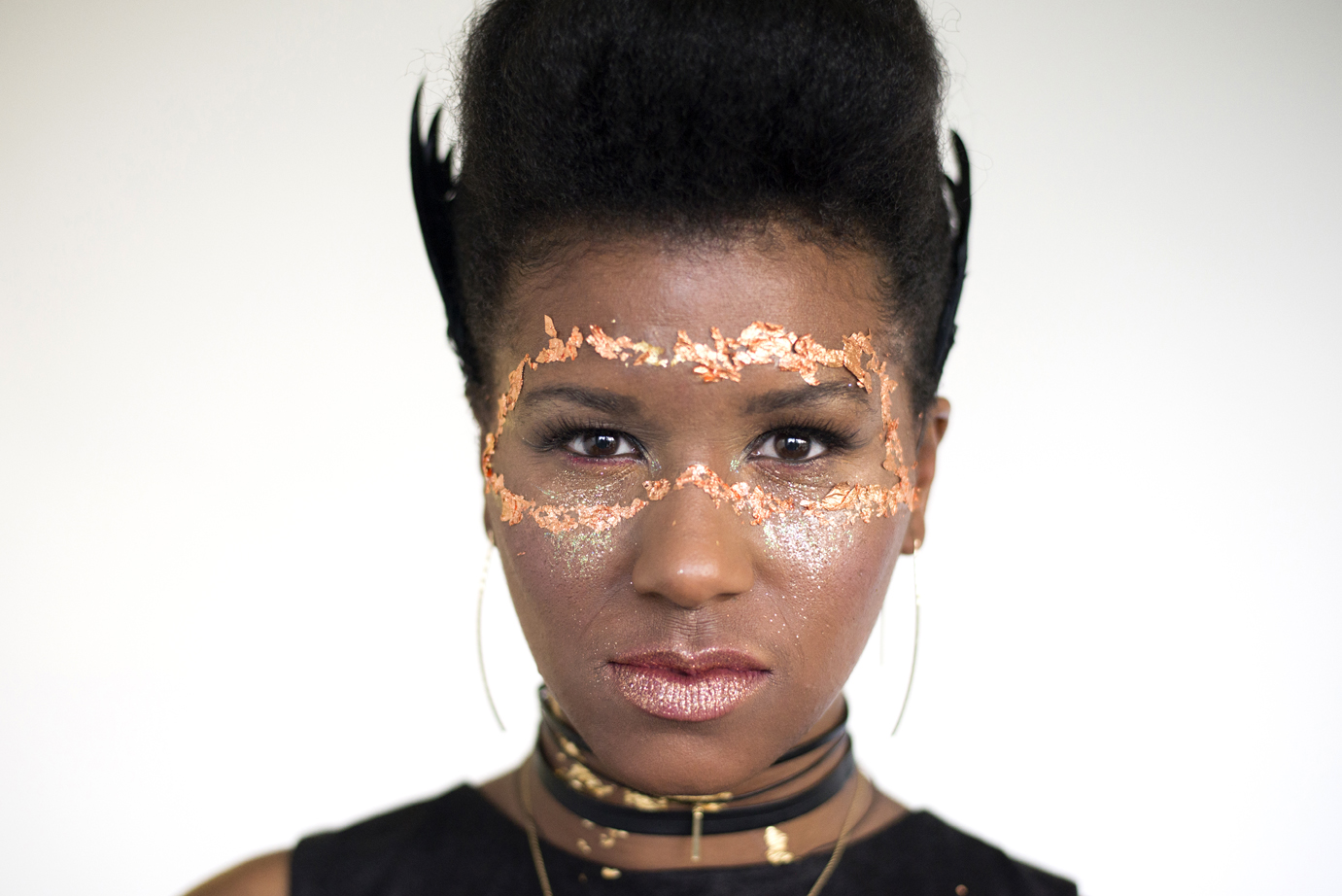The makeup: We layered the model’s makeup with gold glitter and adhered pieces of rose-gold leaf to her face and neck using eyelash glue. Our makeup artist also clipped feather barrettes into her hair.