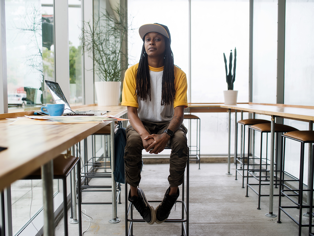 Today, the soft-spoken designer sits inside a coffee shop, wearing jogger pants, a denim jacket and red-and-black Air Jordan 4s. The Baton Rouge native exudes an aura of calmness, and it’s reflected in her easygoing style.