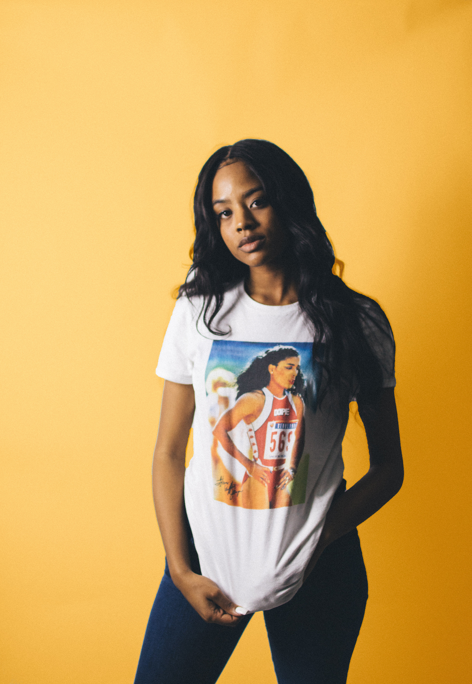Frequently incorporating popular figures from the ’90s in her designs—including rapper and record producer Missy Elliott and the late Olympic track and field champion, Florence “Flo-Jo” Griffith Joyner—Howells says her design inspiration comes from music, movies, current events and her surroundings.