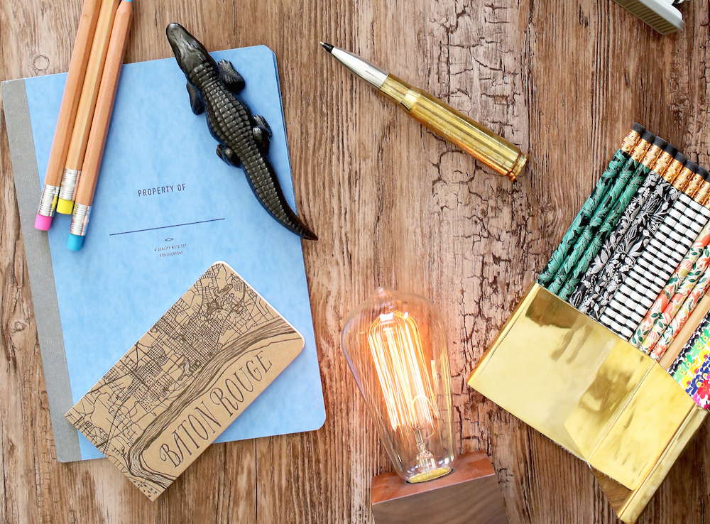 Sketch notes with a graphite pencil shaped like a Louisiana alligator, or pull tape from a rustic tape dispenser made of concrete and wood. Freshen up your space with a plant or two, and finish the look with a lamp reminiscent of your favorite industrial-style bar. After all, it’s 5 o’clock somewhere.