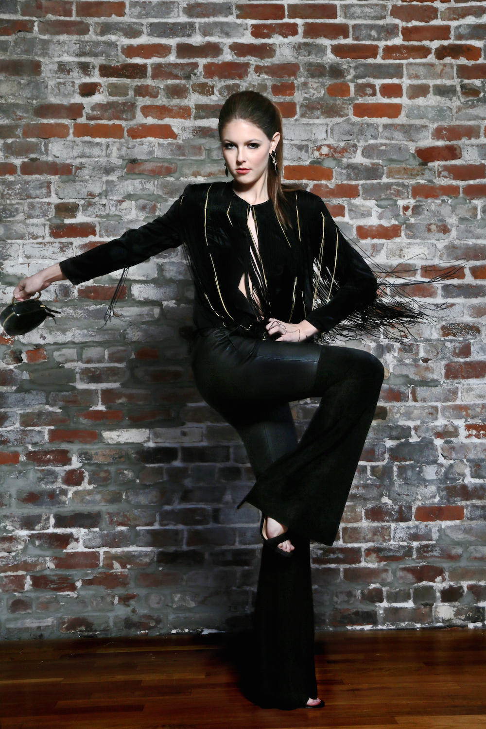 Rachel Zoe black and gold fringe jacket, $795. Rachel Zoe combo suede flare pants, $1,195. Tory Burch black suede sandal, $275. 3.1 Phillip Lim “Alix” circle black clutch, $379. All available at NK Boutique, facebook.com/nkboutiquebr