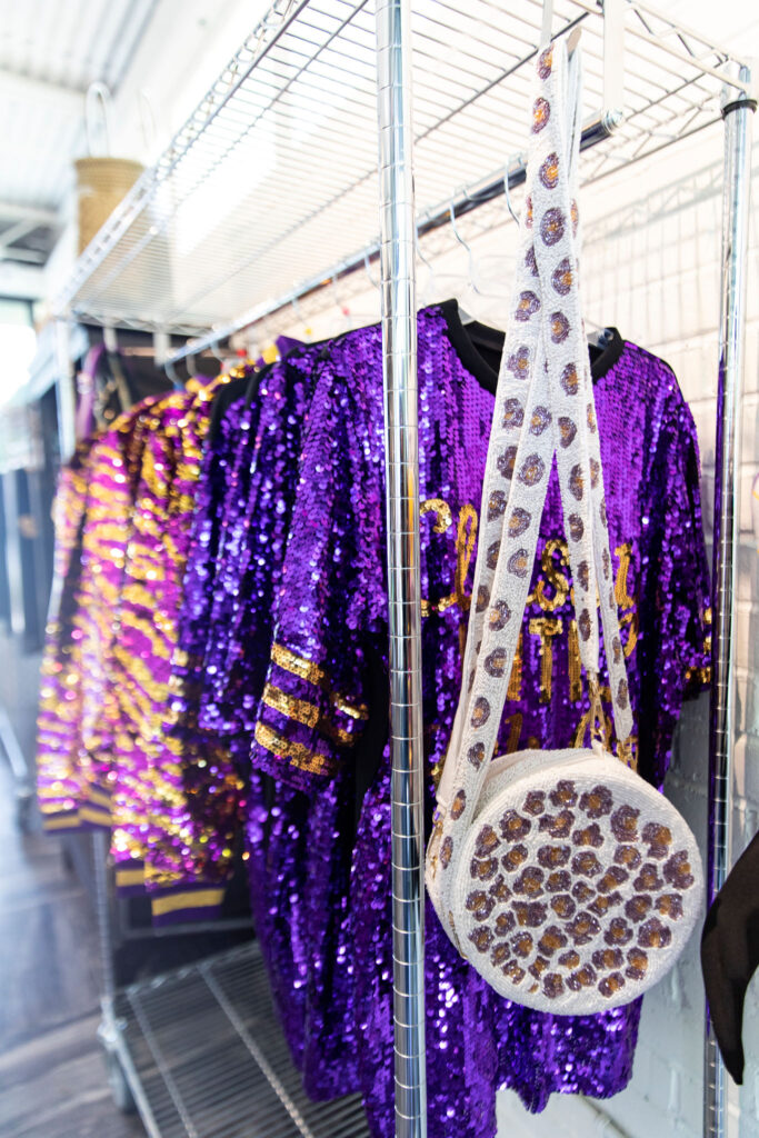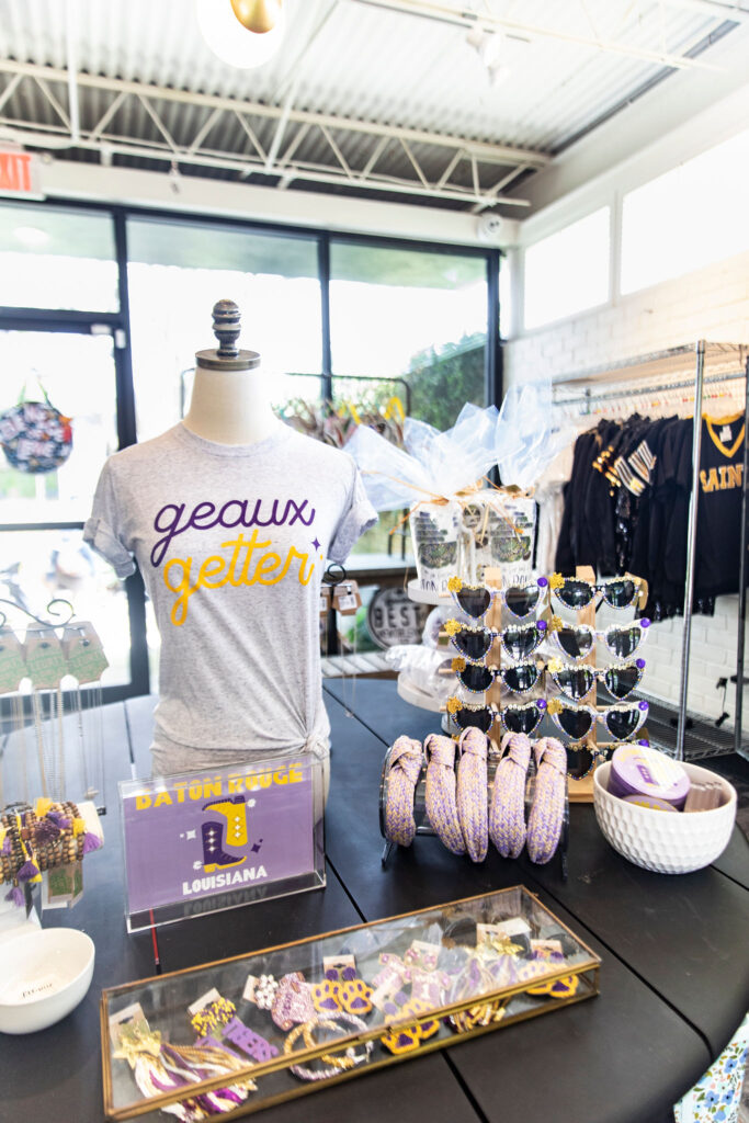 The shop is also fully stocked with all the purple and gold, from face glitter and custom sunglasses to headbands and t-shirts for LSU fans looking to stock up ahead of football season or for a trip to Omaha.