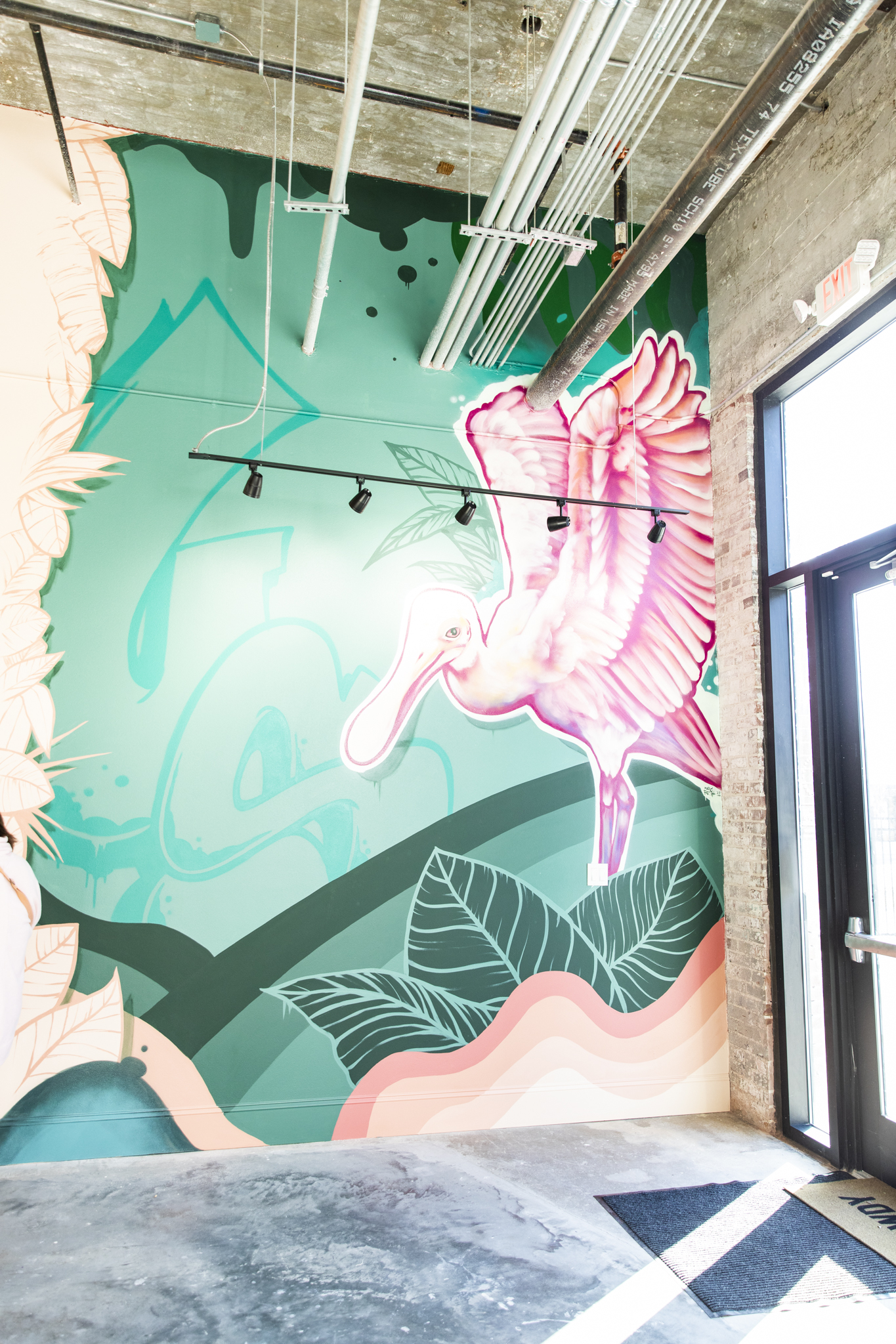 Upon entering, you’ll be greeted by a large mural of a roseate spoonbill nicknamed Rosie. This feathered friend is a nod to Local Supply’s sister store Sweet Baton Rouge, which has Petey the Pelican as its mascot. Both Petey and Rosie were the ideas of Guidry. “These birds of a feather really flock together,” she says. “We have a love for our birds of flight from Louisiana.”