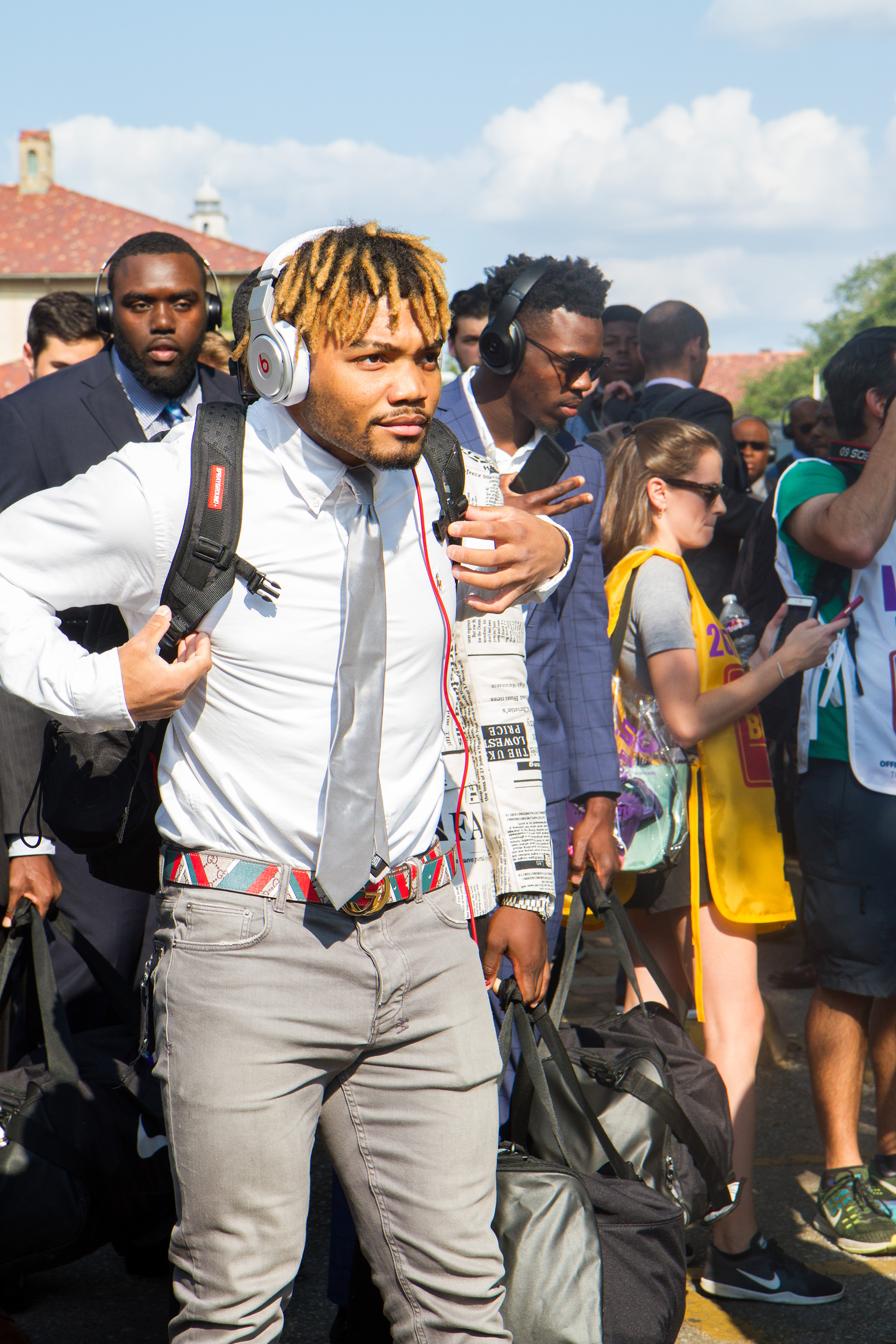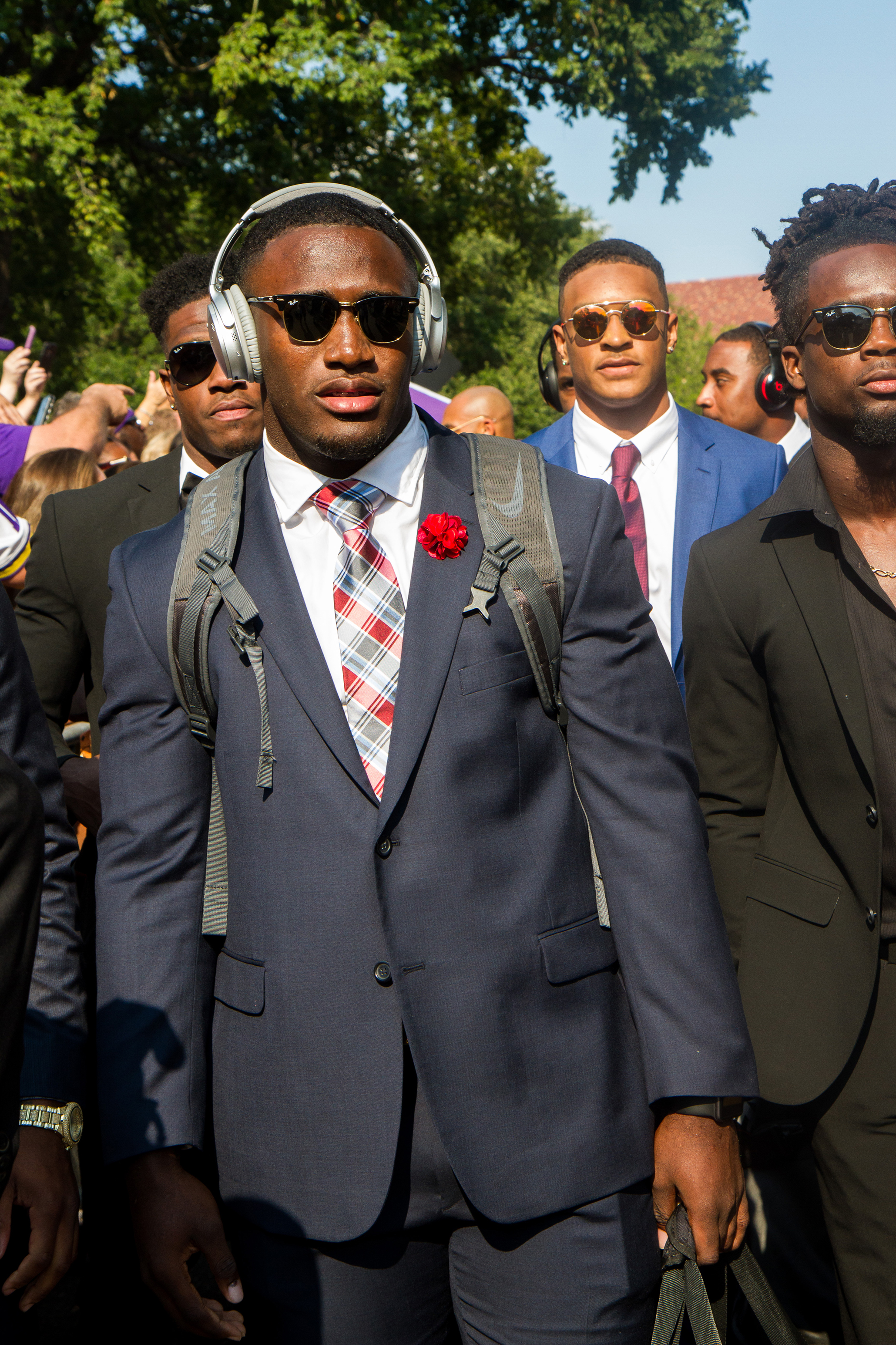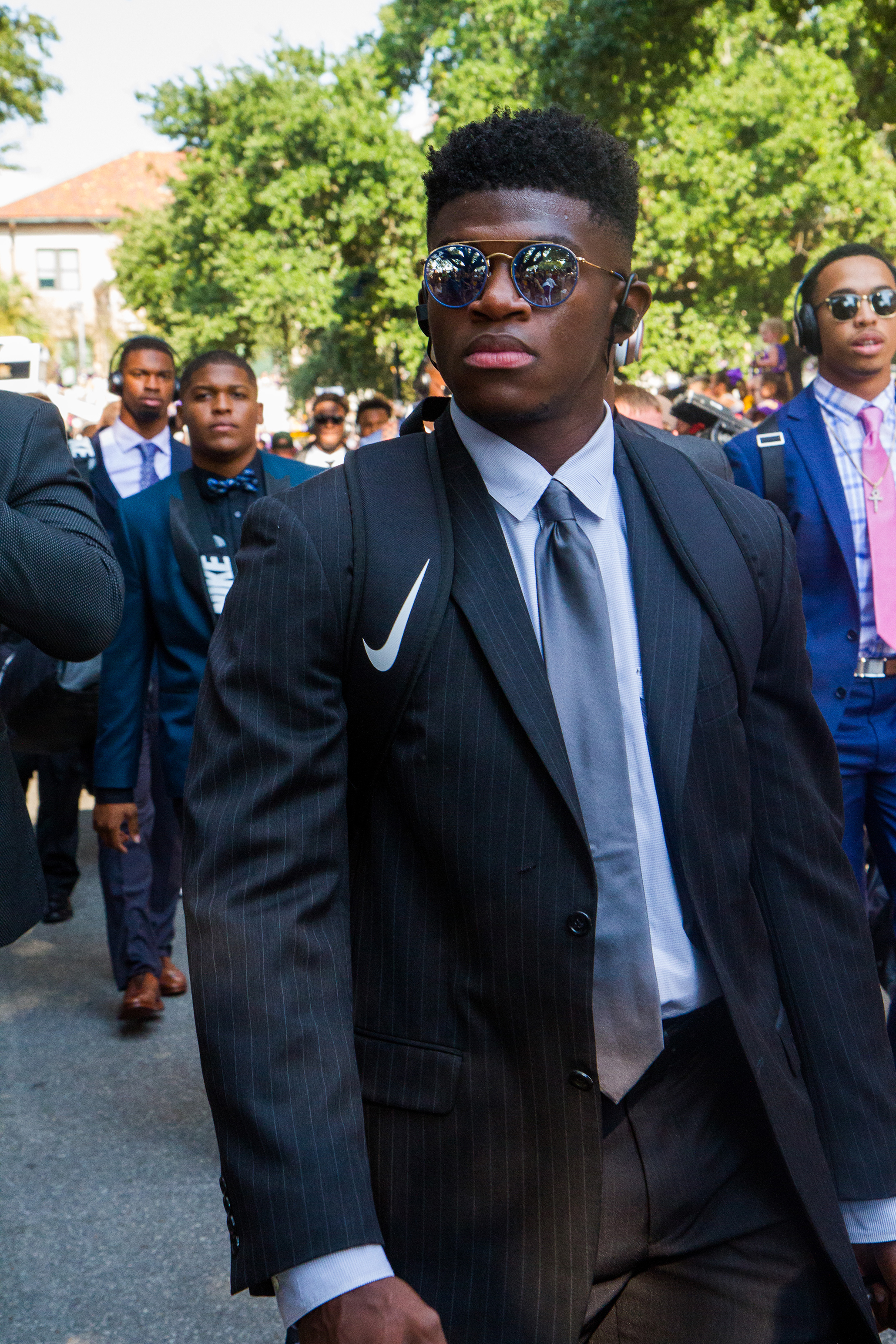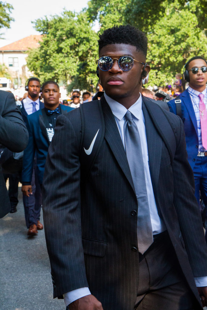 Alexander rocked one of the more eye-catching ensembles in LSU’s first 2017 walk down Victory Hill. He combined a white newspaper-print sport coat and black shirt with black pants featuring a red rose embroidered on the right leg.