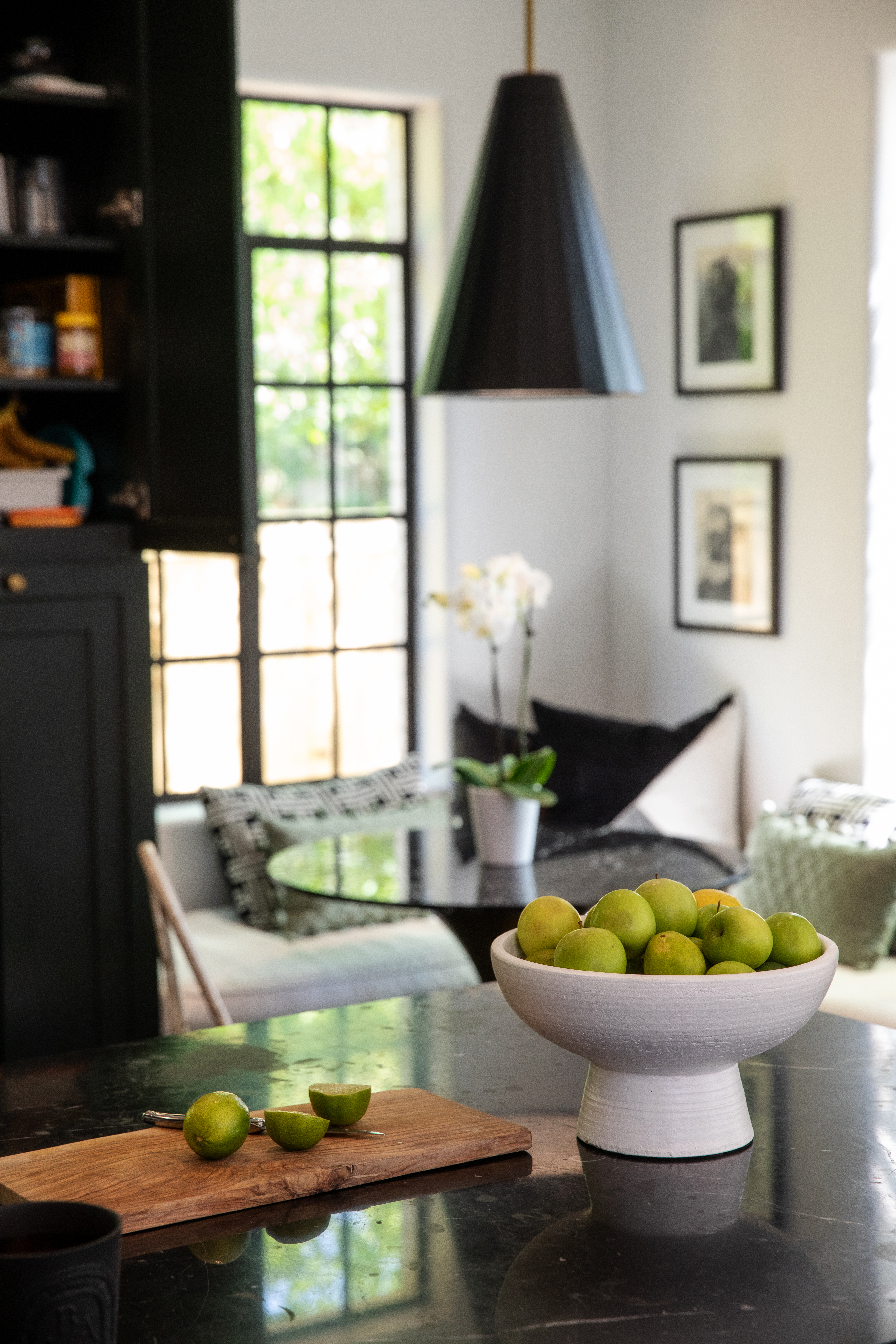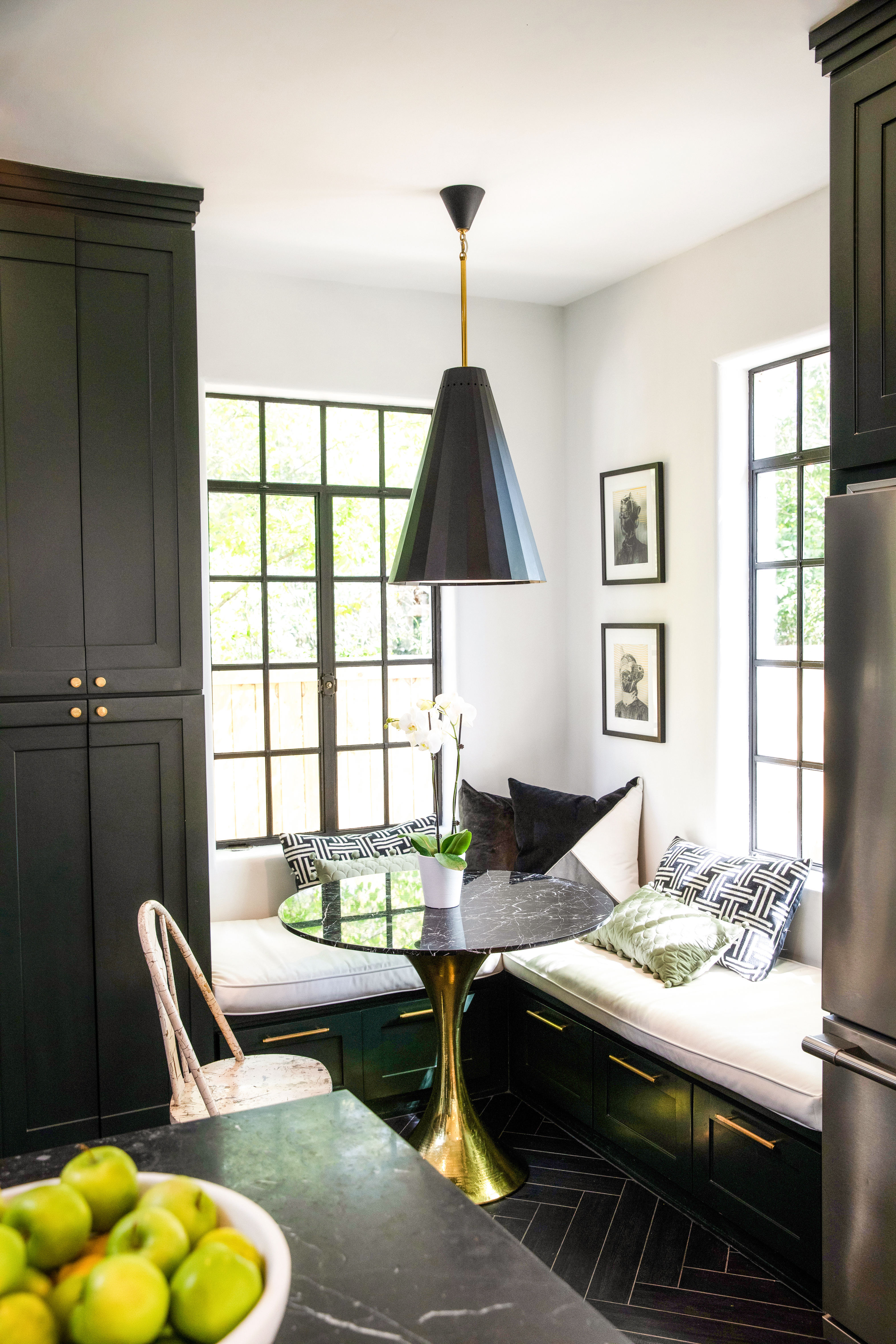 On right: Tiek created a dining nook with a banquet in an area where a former kitchen table used to reside. This bright and sunny space is perfect for early morning coffee. The banquet works double duty as seating and storage.