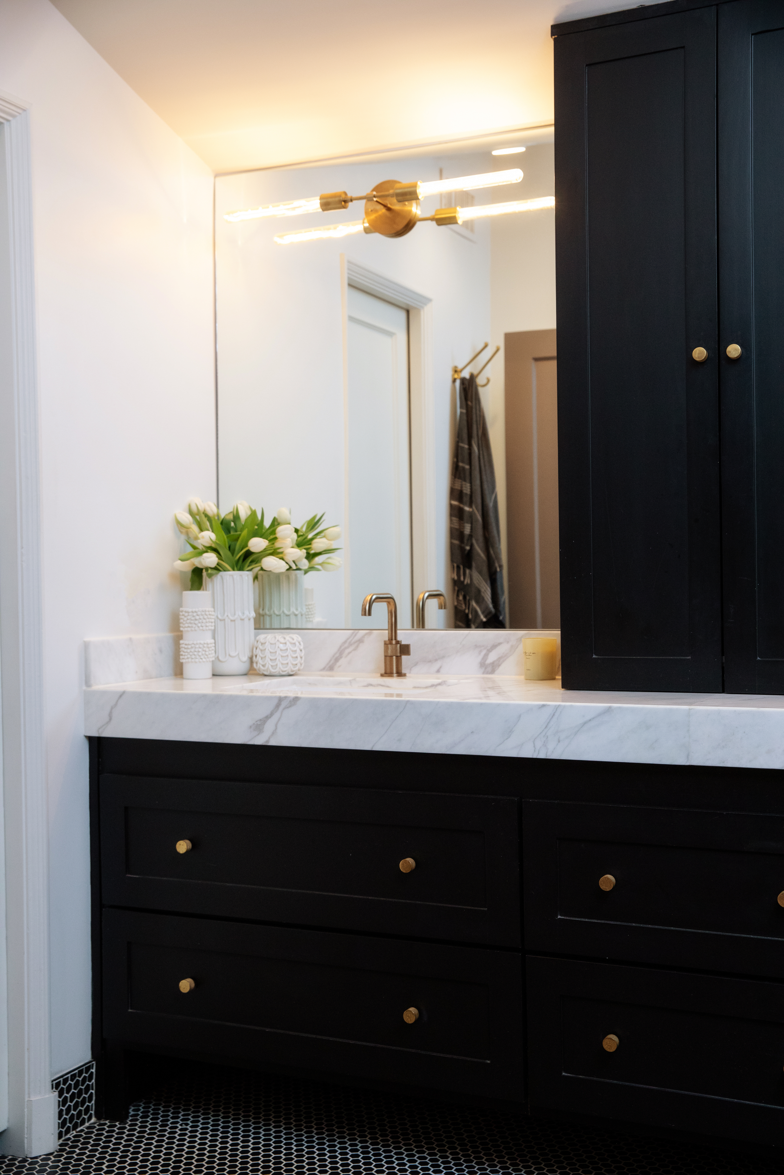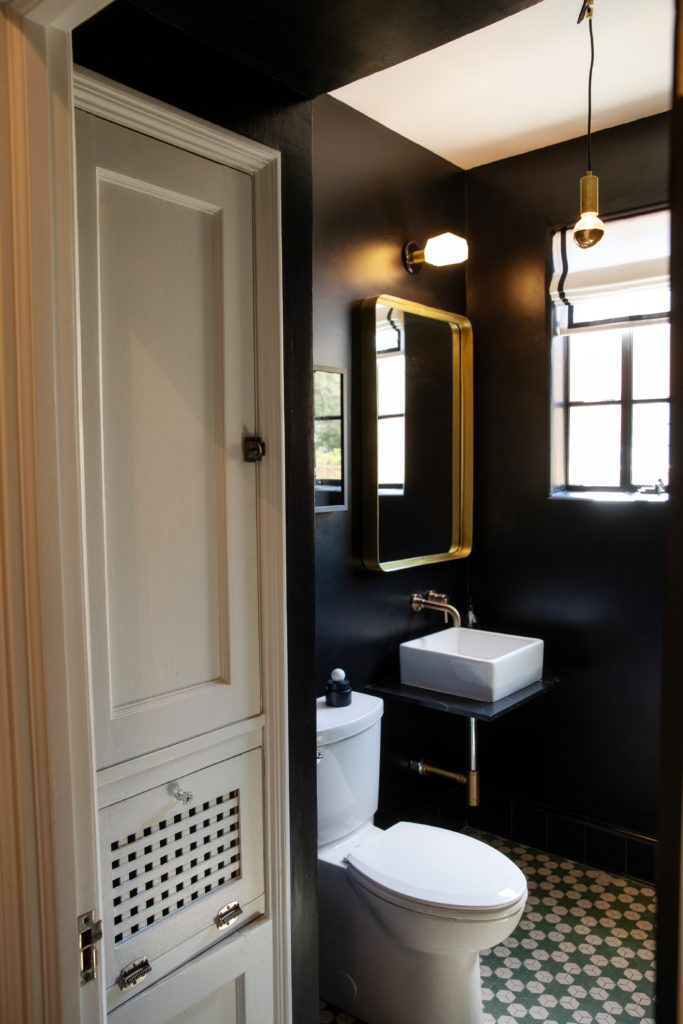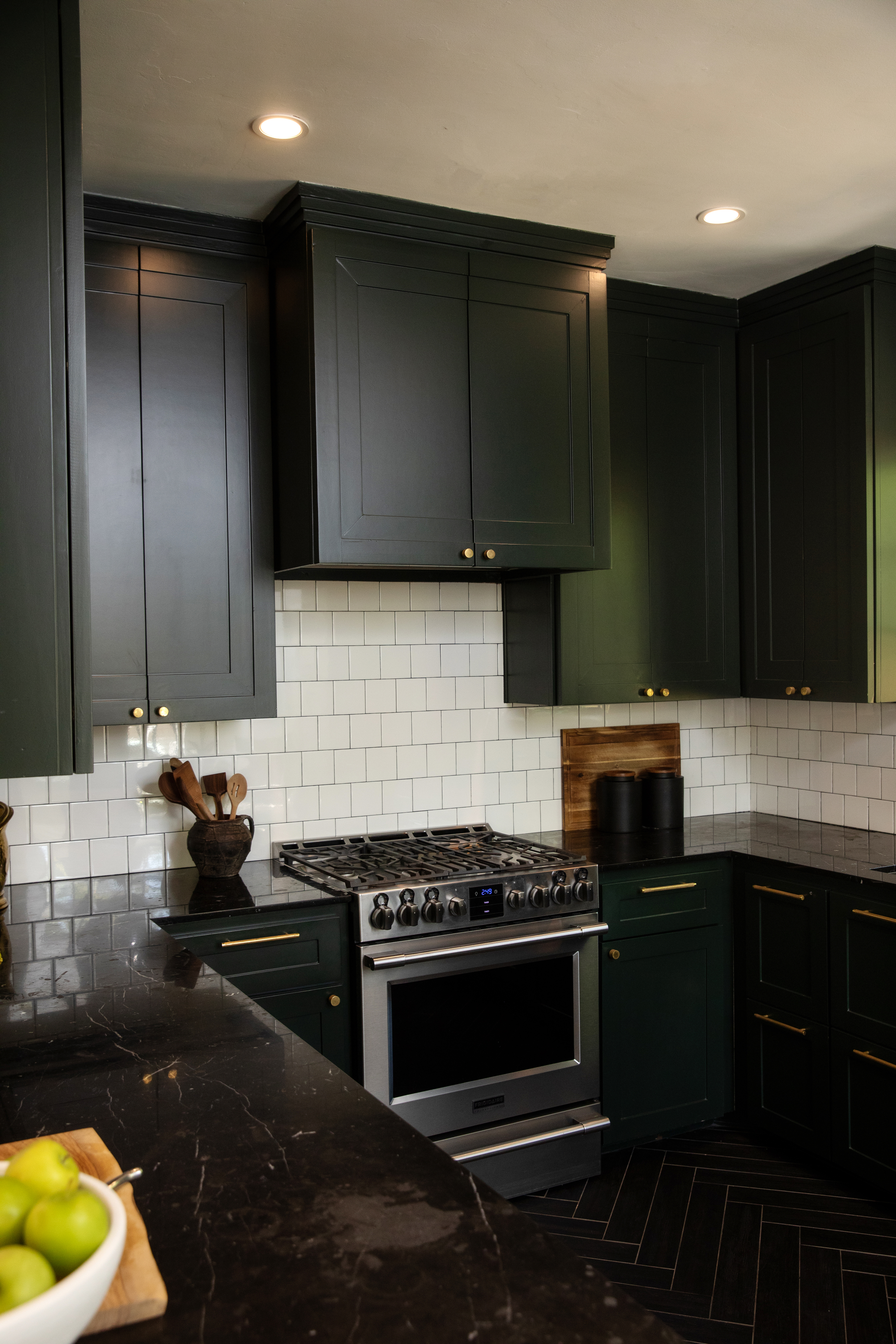 The kitchen in the original house was a tiny walk-through galley, with only a sink, a few cabinets and a range. Tiek closed off one wall and opened up another to create a more usable floor plan. Custom cabinets, a herringbone pattern on the porcelain floor, and black marble countertops create an art deco vibe.