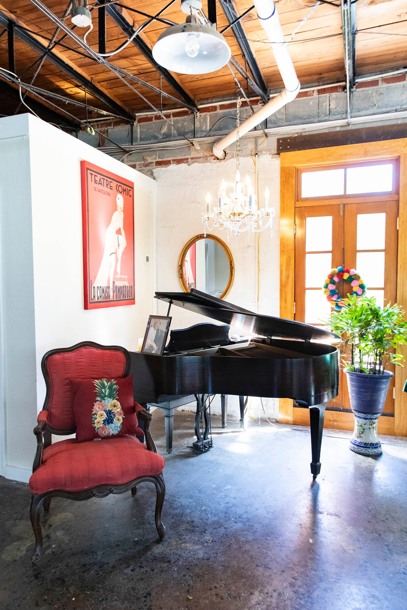 Music, in fact, is another design through line, she says. In one corner sits a baby grand piano, a vintage score Noonan lucked upon from a fellow Baton Rouge picker specializing in pianos. It bears a picture of Noonan’s late sister, Marci, who was an accomplished jazz pianist.