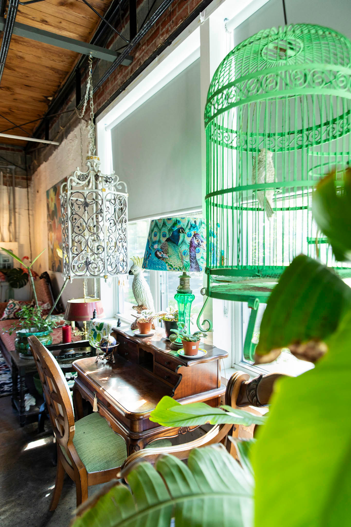 Noonan, a self-described “junker,” is one of those people who sees infinite possibility in castoffs. She’s a chronic Facebook Marketplace shopper, has a talent for repurposing furniture and is constantly on the hunt for roadside gems. Her vision, and that of contractor Scott McMahan and designer Catherine Boley, led to a style mashup for Garden House that blends European antiques, rescued chandeliers, bird cages, exposed brick and concrete walls, and the occasional new thing—like disco lighting. You’re just as likely to stumble upon a carnival monkey figurine as you are a fancy French settee.