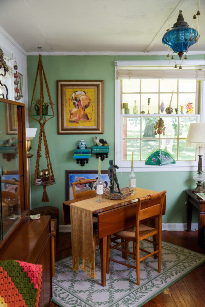 Their next project: turning their house into a maximalist, no-rules space that reflects their life together. Inside the 950-square-foot two-bedroom, nearly every inch is covered with the couple’s art, antique finds or upcycled pieces.