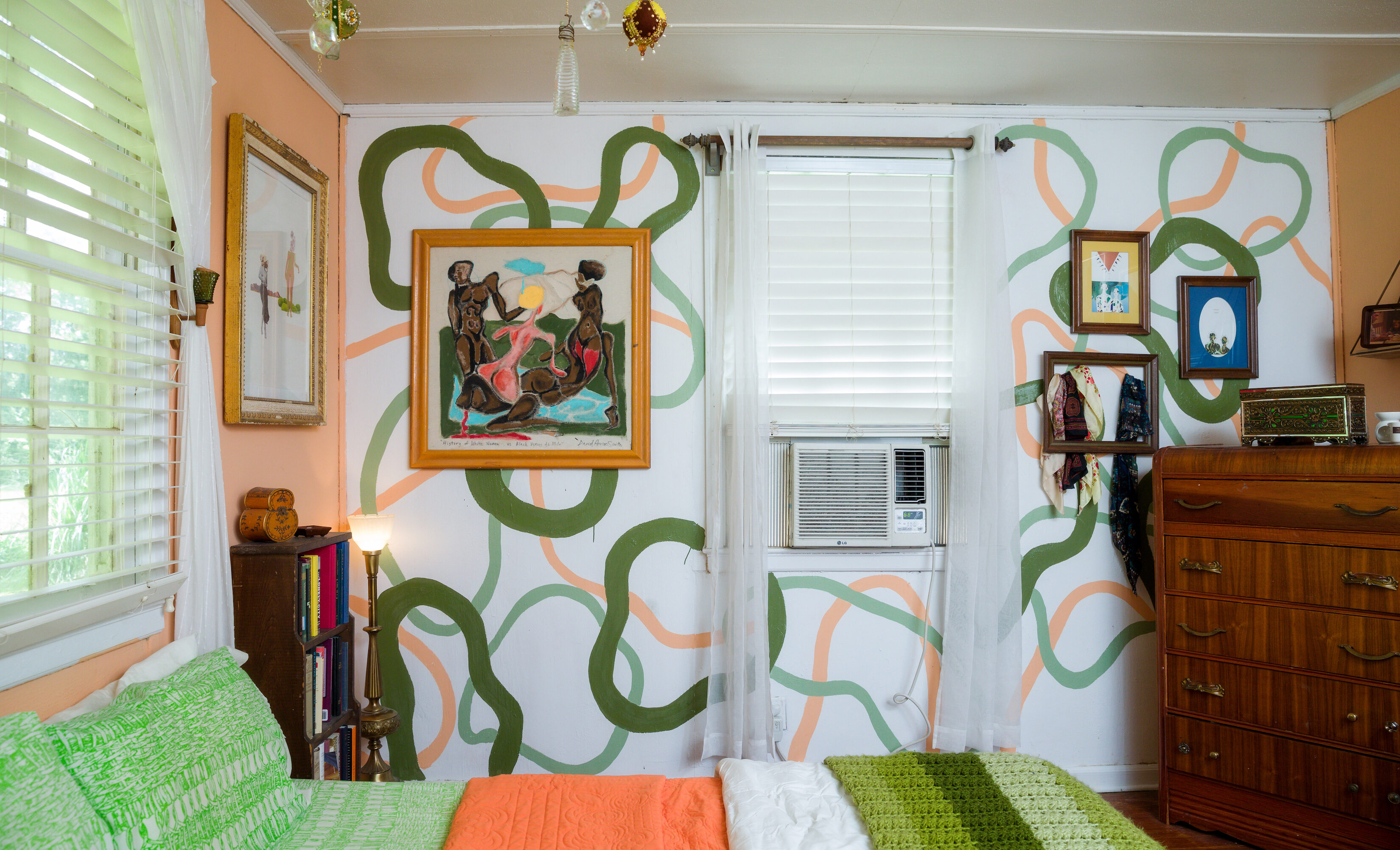 In their bedroom, crystals and rocks hang from strings over the bed like a makeshift chandelier. Doherty painted the walls a punchy sherbet hue found in Home Depot’s “oops paint” section. When she ended up having only enough color to paint one wall, she improvised, covering the remaining walls with wavy abstract shapes, complementing the orange with shades of sage.