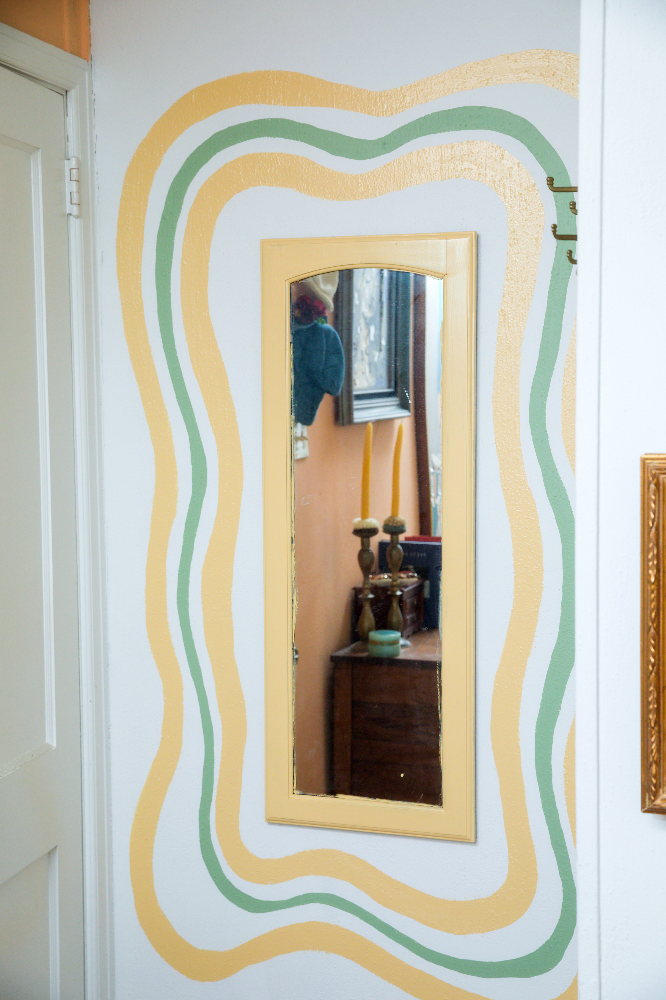 “Painting is so meditative, so I figured I’d just paint a design on the walls, and if I didn’t like it, I’d paint over it,” she says. “I’m always iffy about my work, but when Aaron came into the room, he loved it. So it stuck.”