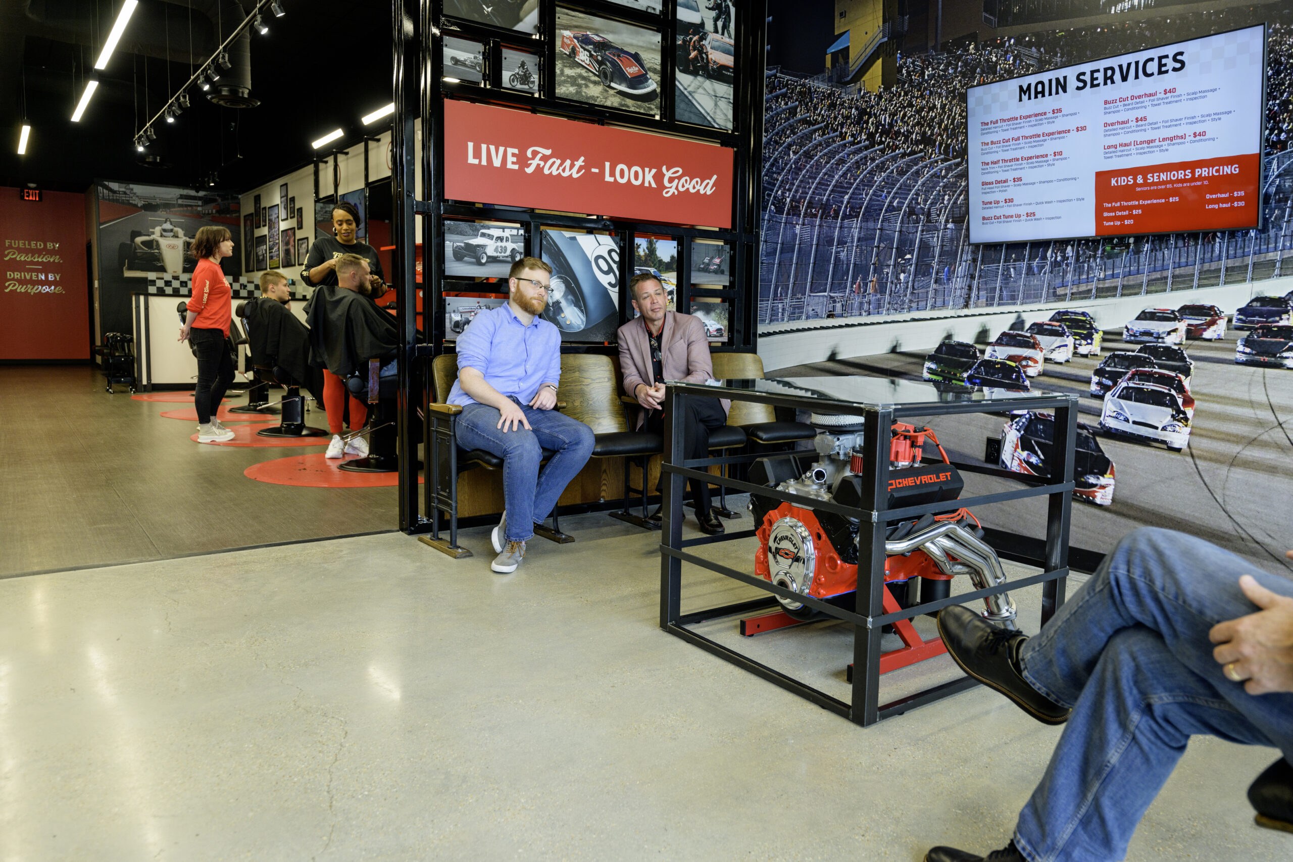 Stylists’ workstations mimic a mechanic’s tool bench, and comfy leather styling chairs nod to the interiors of high-end automobiles. Racing paraphernalia is scattered throughout the salon. A large engine greets patrons in the waiting area, along with a wall-sized print of race cars in action.