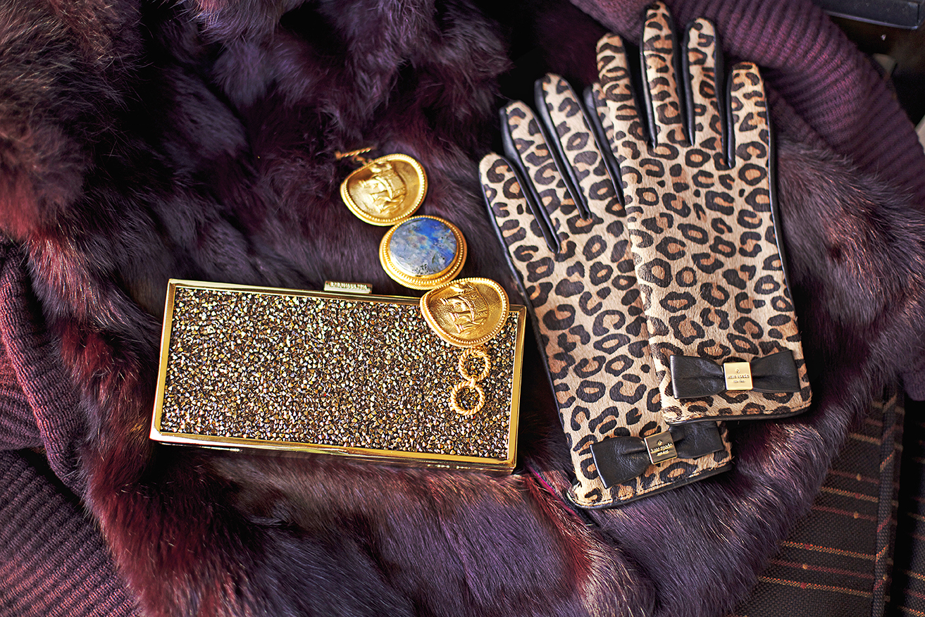 Nanette Lepore jacket; BCBGMAXAZRIA clutch; Kate Spade gloves; Gypsy bracelet.All items available at NK Boutique.
