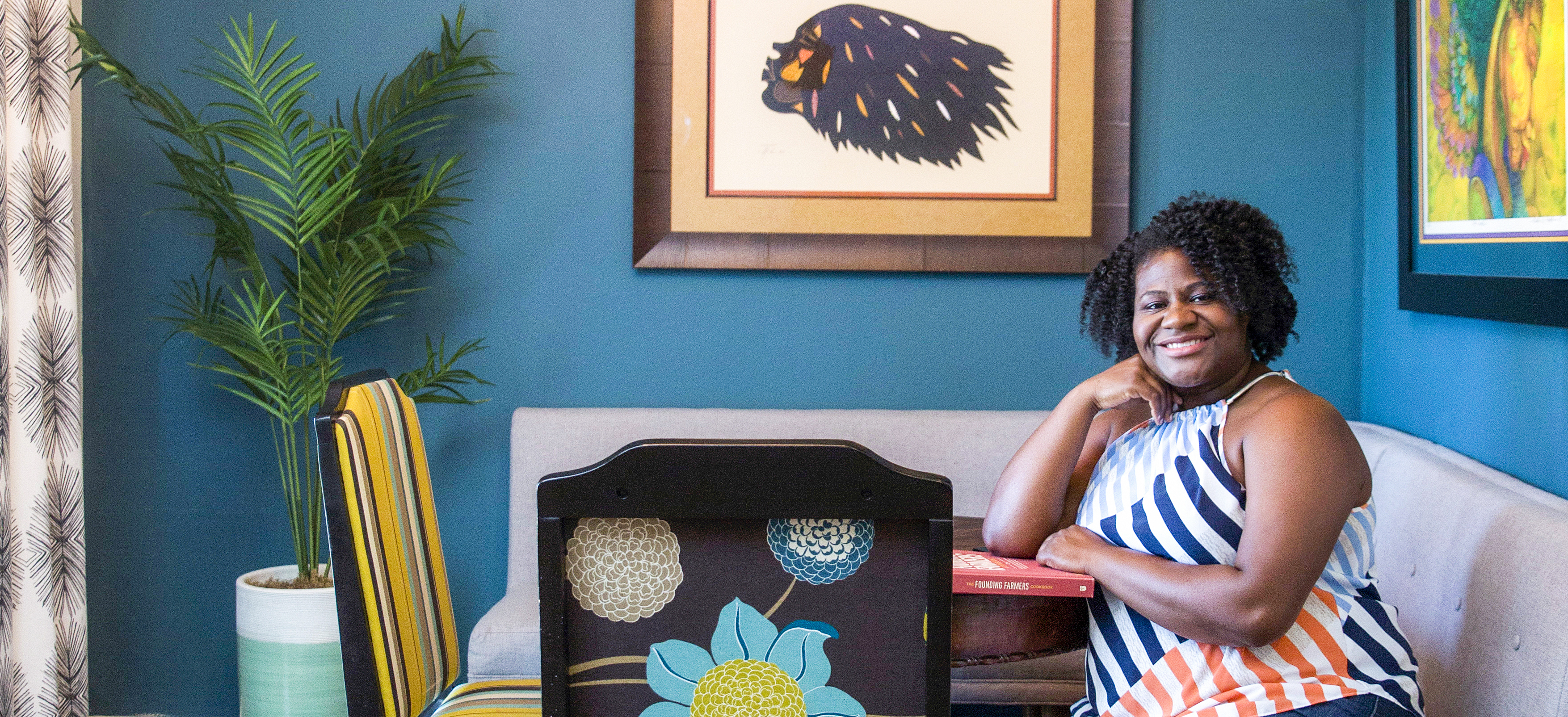 Last year, the busy entrepreneur hired local interior designer Arianne Bellizaire to transform her 1,300-square-foot two-bedroom apartment. Now, she says her mom and her friends tell her the space is “so you.” In fact, today she is dressed in the same colors as her living room. Her blue and orange striped tank match her teal couch and orange side tables.