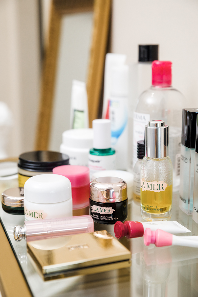 any makeup or dirt from the day. Then, I use a toner, essence and serum. After, I apply an eye serum around my eyes, an acne cream (only when I have breakouts), a moisturizer, facial oil and lip mask.
