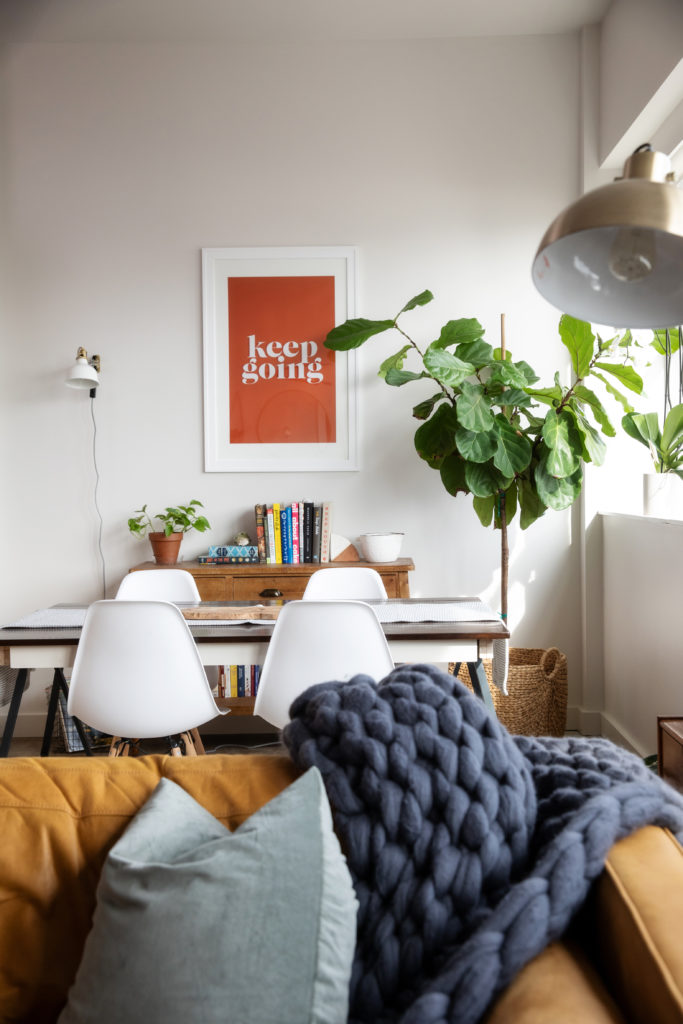 He has a small collection of plants, which he half-jokingly says he likes to make conversation with. Each one seems carefully chosen for its personality, with nearly human-like qualities. By the window is a skinny, fuzzy fairy-castle cactus. Next to the TV, there’s a charming little Chinese money plant, with cheerful, almost lily-pad-round leaves. A fiddle leaf fig, though, is his plant pride and joy. It towers over his dining table, branches and bright green leaves growing in every direction. He has affectionately named it Theo.