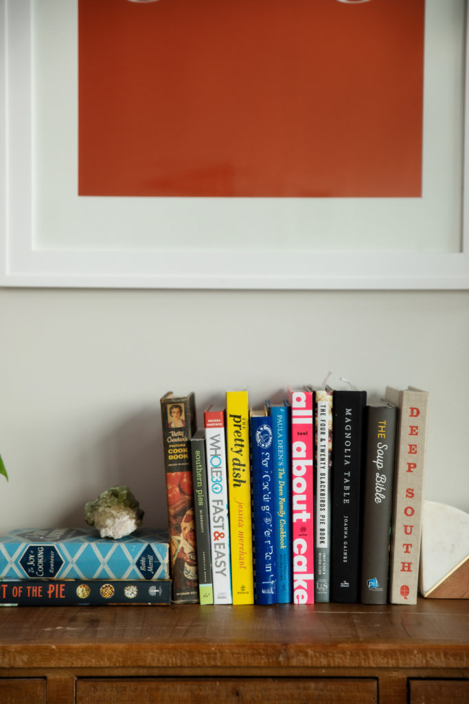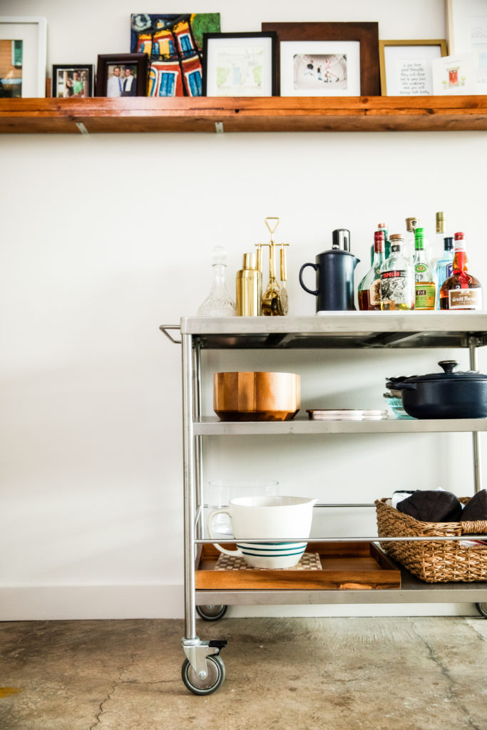 On right: A metal cart off the kitchen provides extra storage for Garcia’s cocktail supplies and cookware, including his trusty Le Creuset dutch oven. A wooden ledge is a catchall for cards, photos and small art pieces.