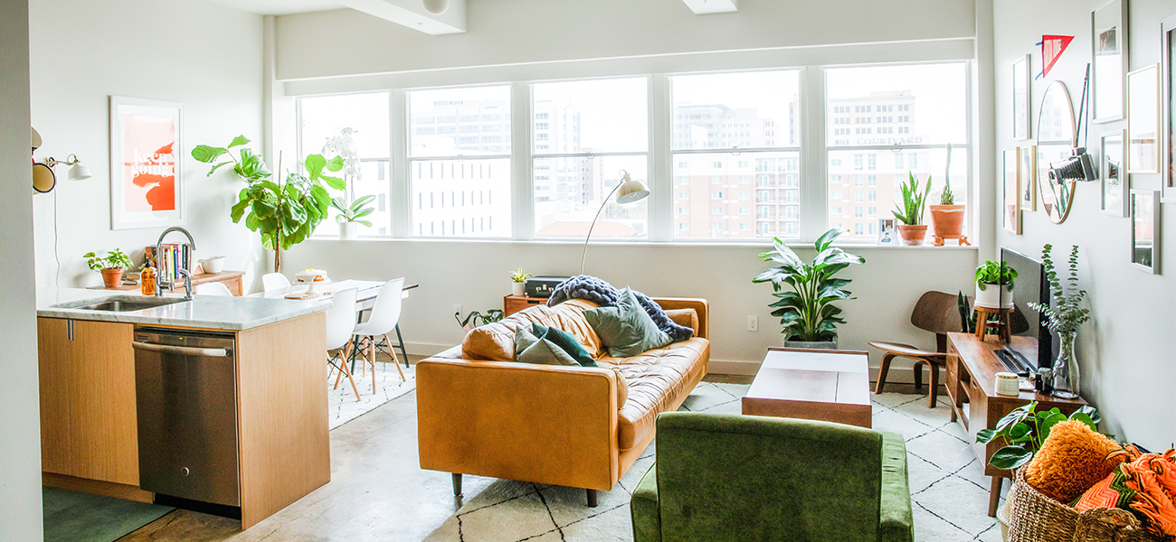 The living area is an ode to all of Garcia’s favorite things: photos from memorable vacations, throws, plants and his caramel-colored leather sofa from Article.