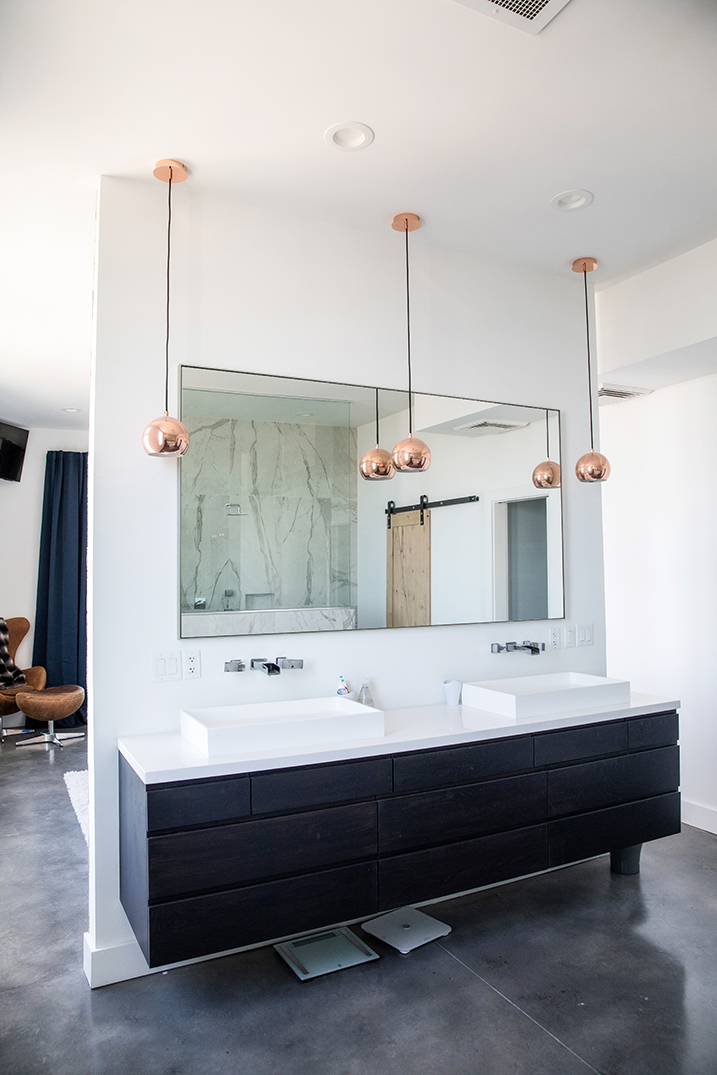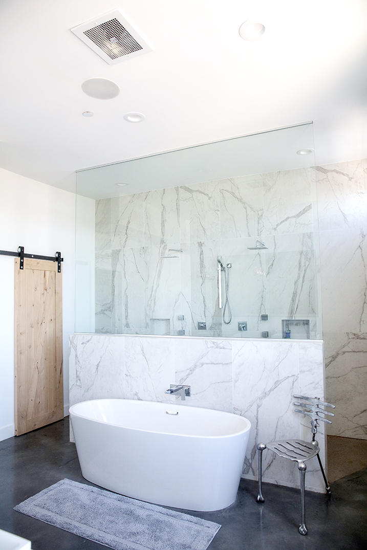 The master bathroom features double showers and a walk-in closet behind barn doors. Bailey had long admired the steel skeleton-shaped chair, which once belonged to his mother. He convinced her to give it him after his renovation.
