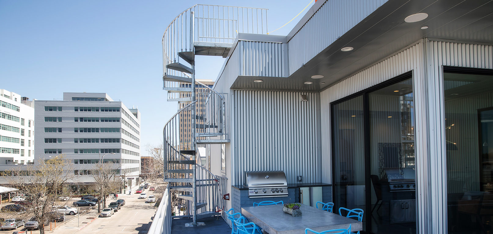 Then there was the time a movie producer spotted his place. The producer was standing a quarter-mile away, scouting film locations at the 525 Lafayette apartment complex. He couldn’t take his eyes off the spiral staircase on Bailey’s balcony. The corrugated metal staircase juts over the street below, leading to a rooftop terrace.