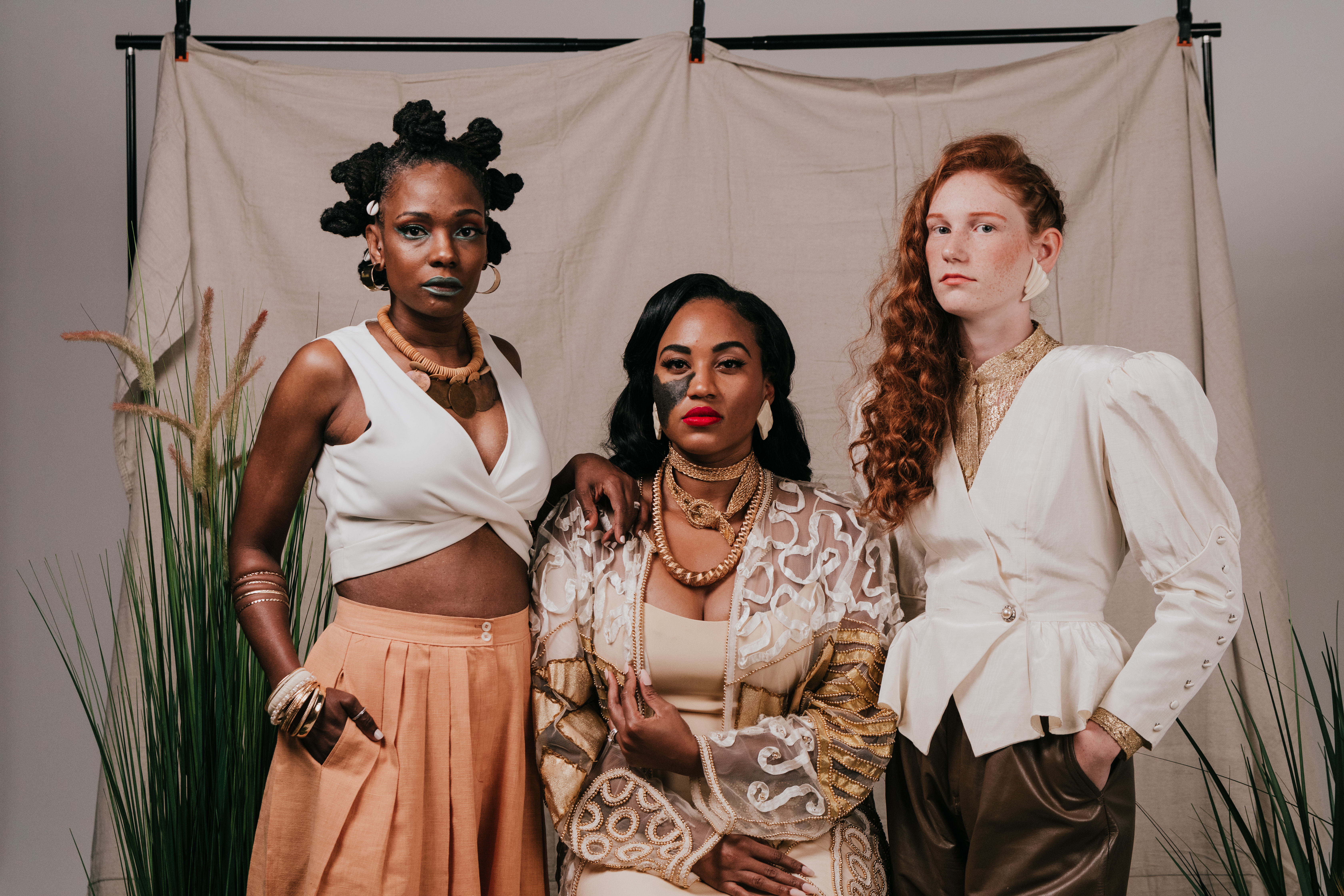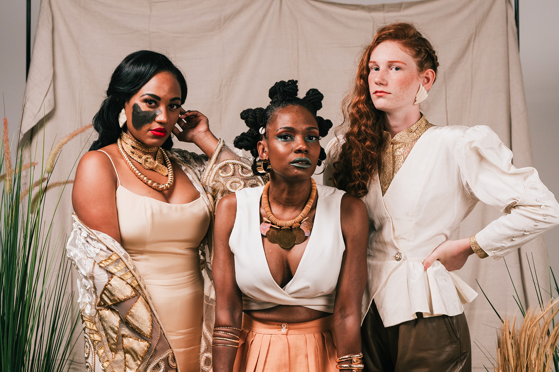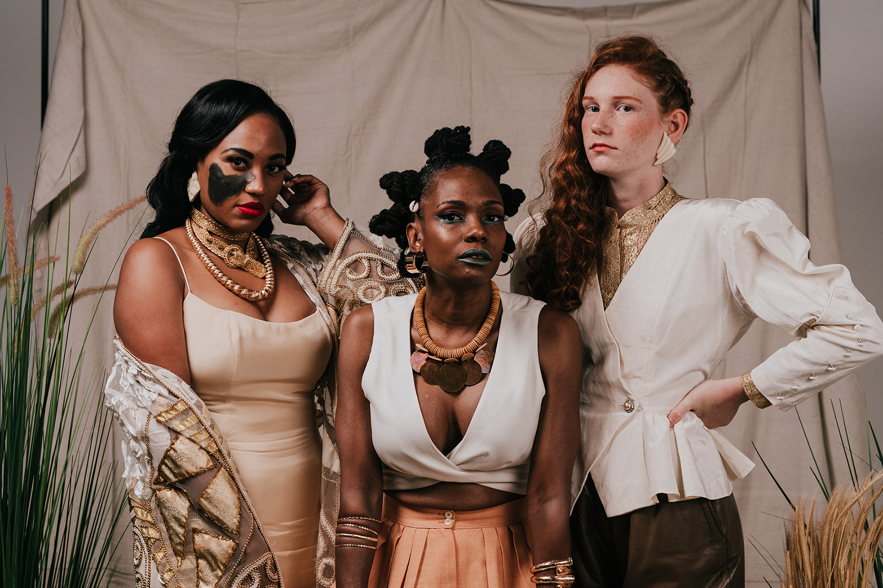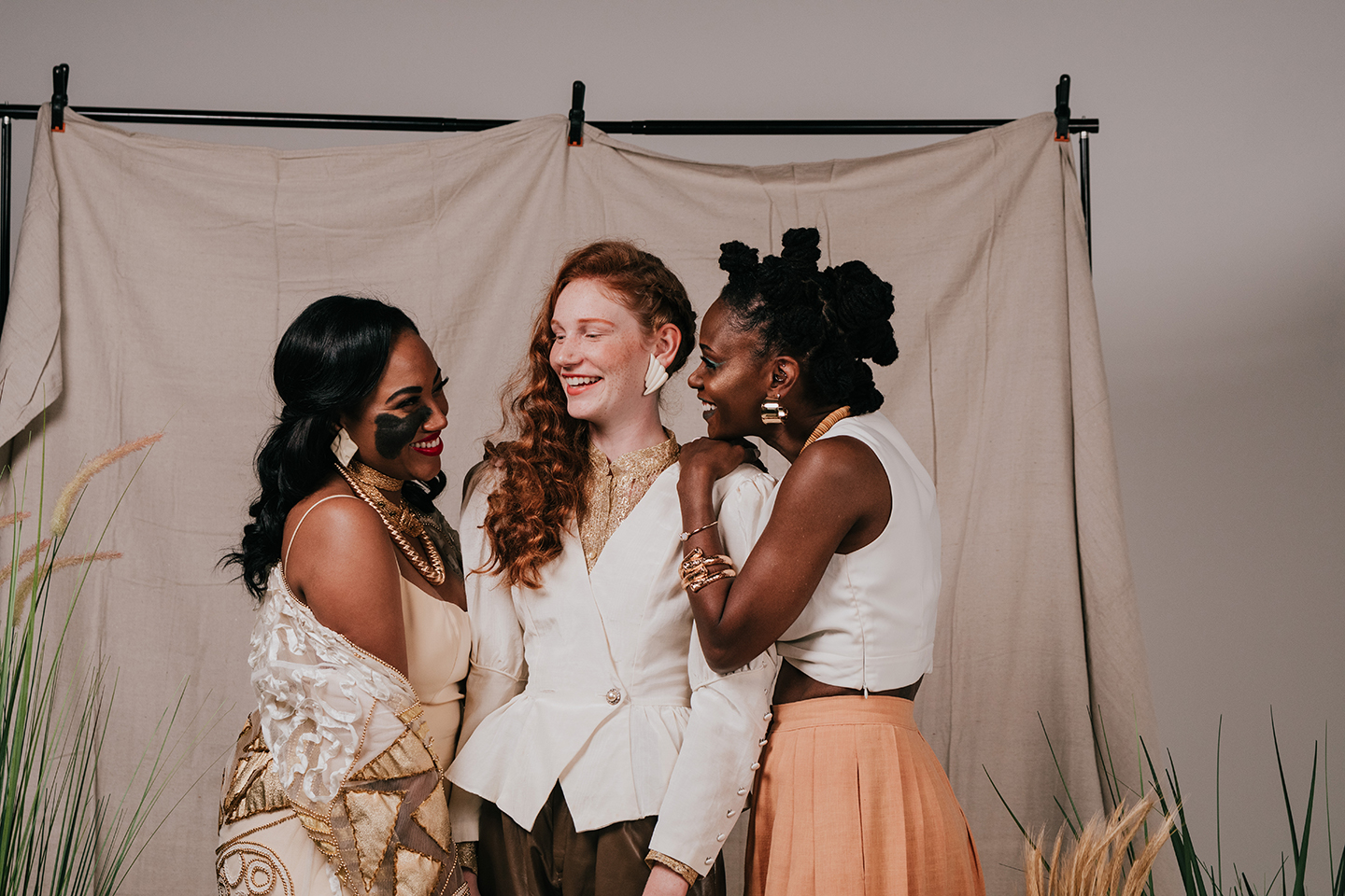 225 wanted to be a part of the revolution. We intentionally chose to feature three local women with different skin conditions and styled them in neutrals and earth tones to complement their natural skin. Glimmering golds, crisp whites and variations of brown accentuated their unique complexions. Dressed in a mix of vintage and modern clothing and accessories, the women were styled like royalty.