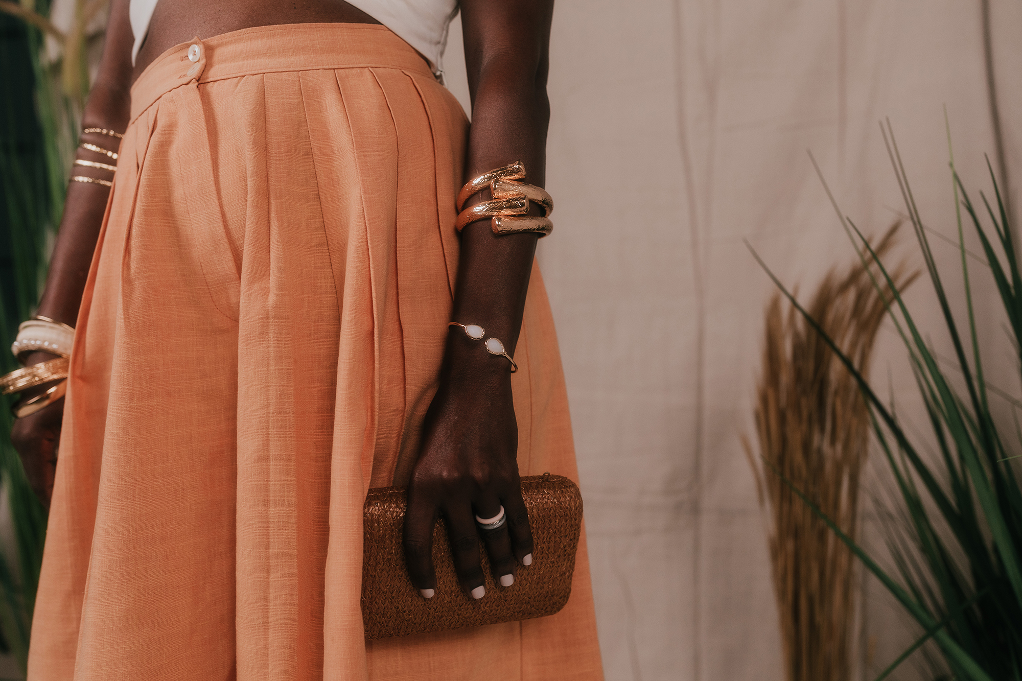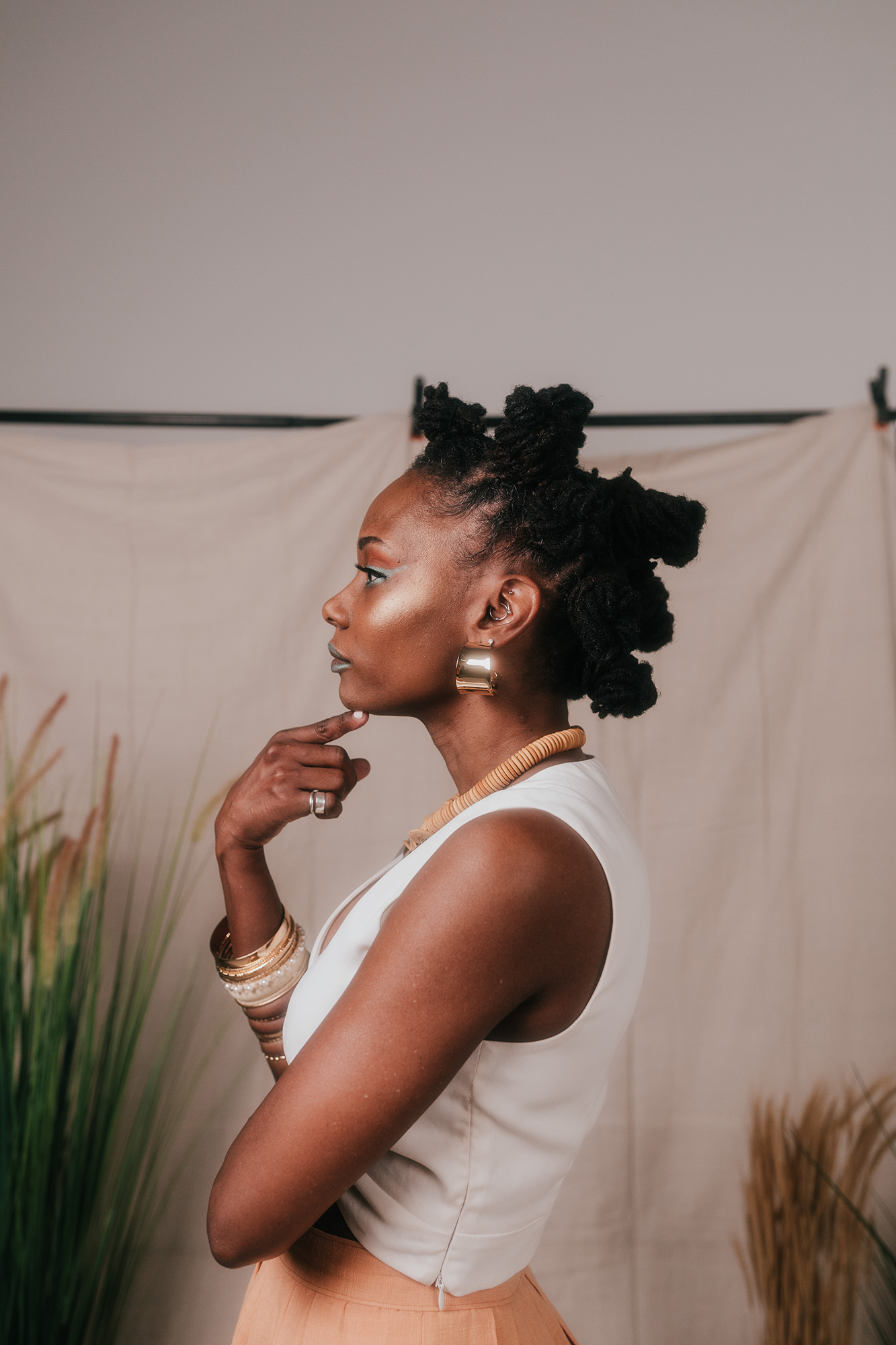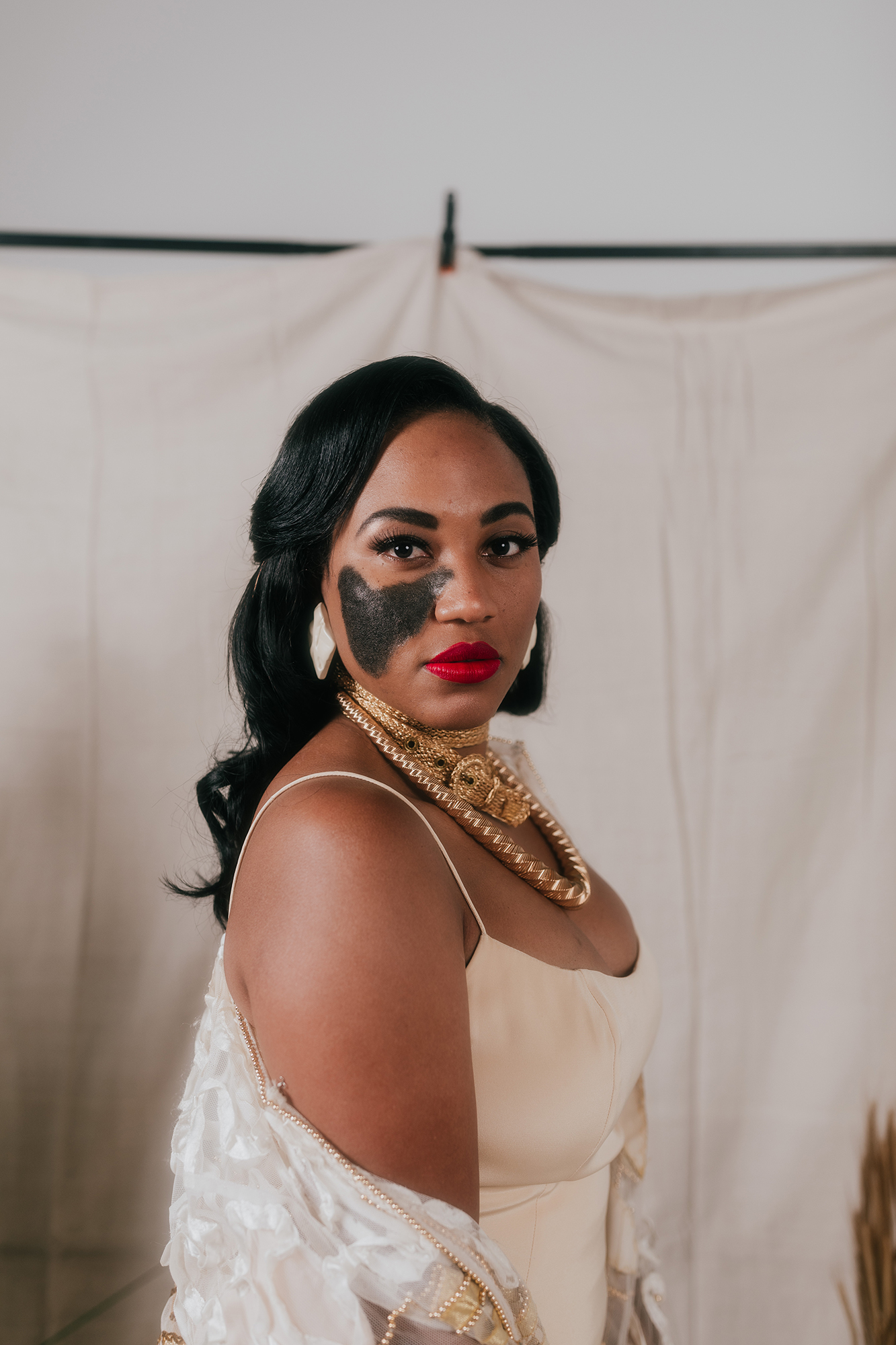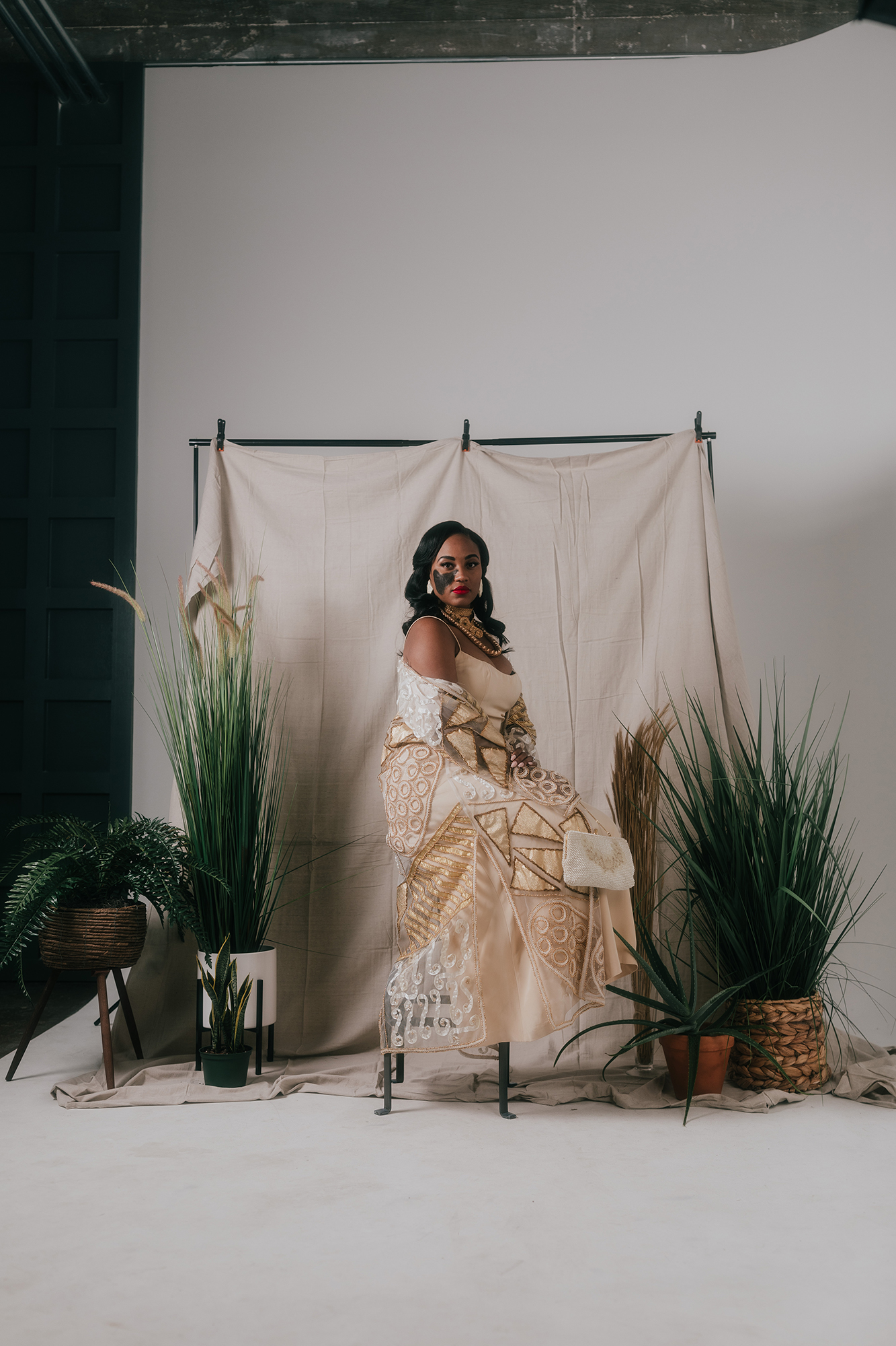 225 wanted to be a part of the revolution. We intentionally chose to feature three local women with different skin conditions and styled them in neutrals and earth tones to complement their natural skin. Glimmering golds, crisp whites and variations of brown accentuated their unique complexions. Dressed in a mix of vintage and modern clothing and accessories, the women were styled like royalty.