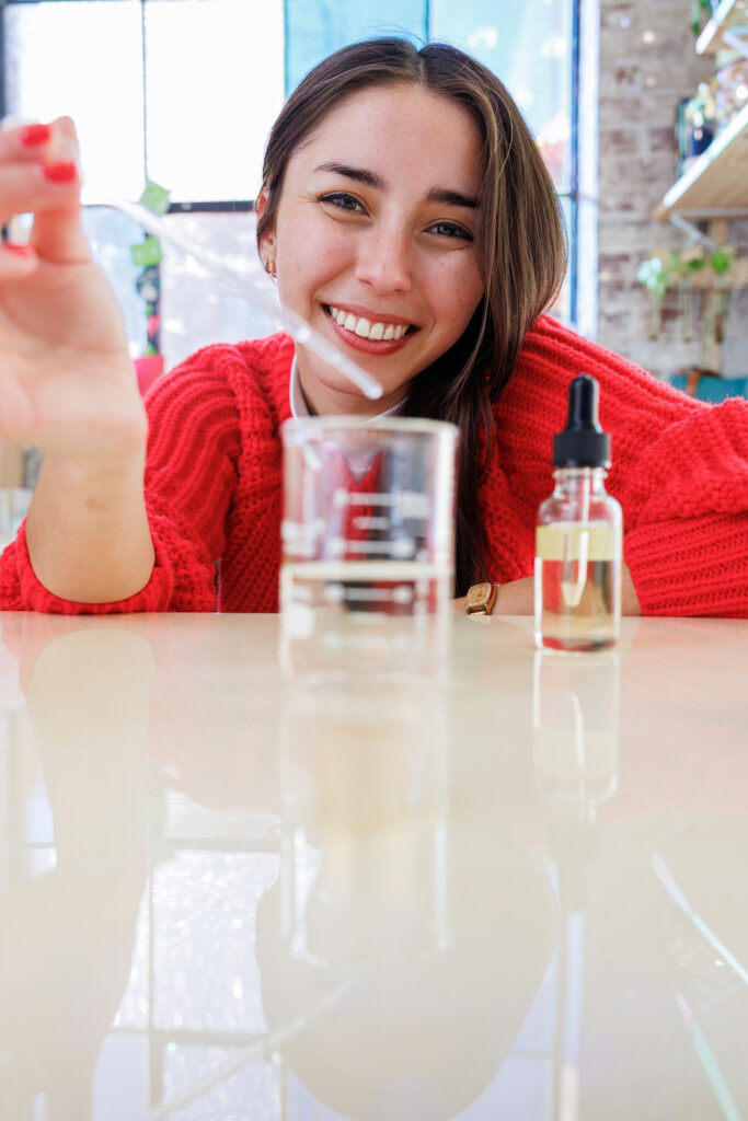 2. Montour plays scientist using pipettes to add the liquid to either a tube or a bottle. Bayou Aroma’s customers are allowed up to 10 milliliters of oils.