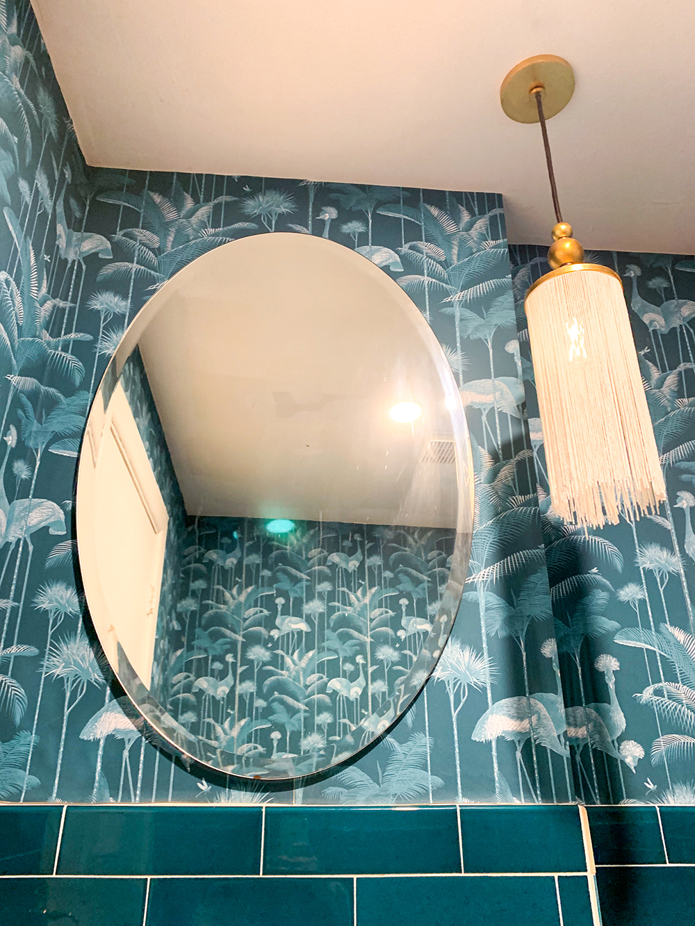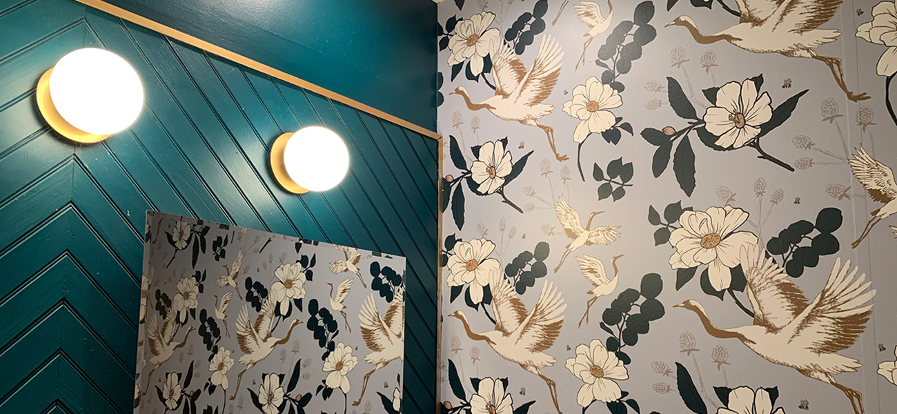 For the restrooms, Xdesign senior graphic designer Simone Broussard translated some of the intricate, ornate illustration work she’d done for the restaurant into a custom wallpaper. White magnolias and majestic egrets glide over a deep teal background.