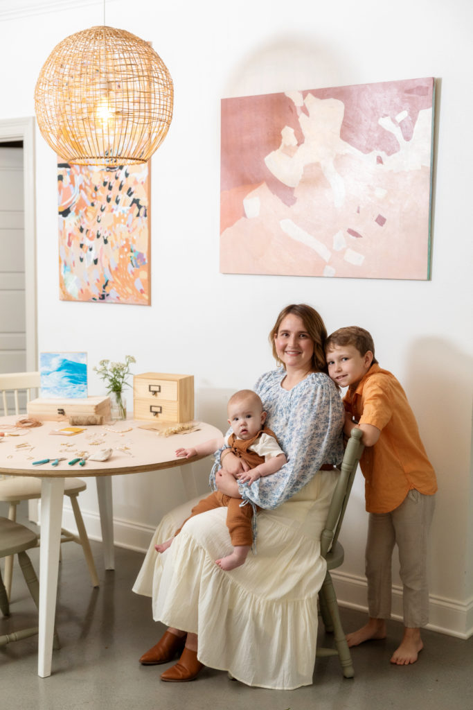In shades of sandy browns, muted greens and peachy terracottas, her warm style is ever-present, from her home’s light fixtures to the diaper bag in her closet. It’s in her artwork, too.