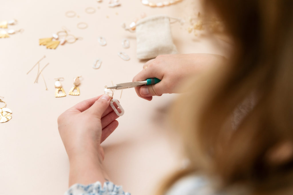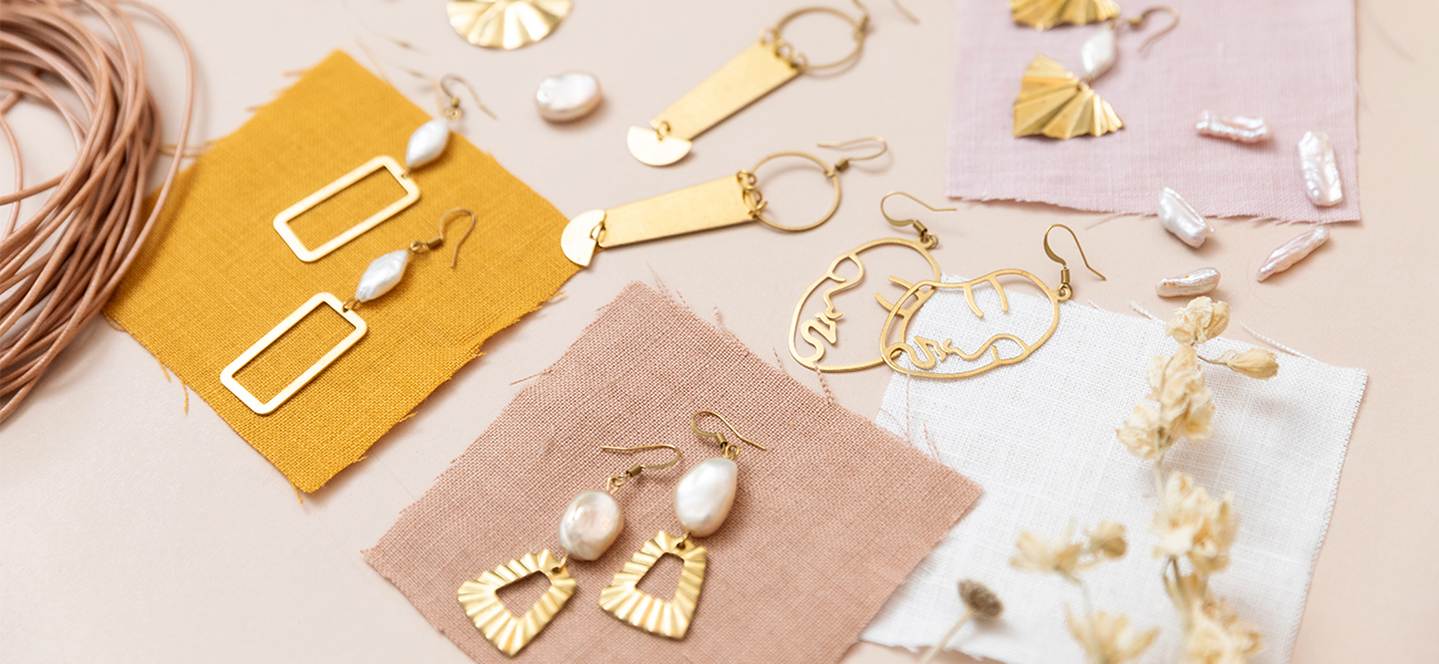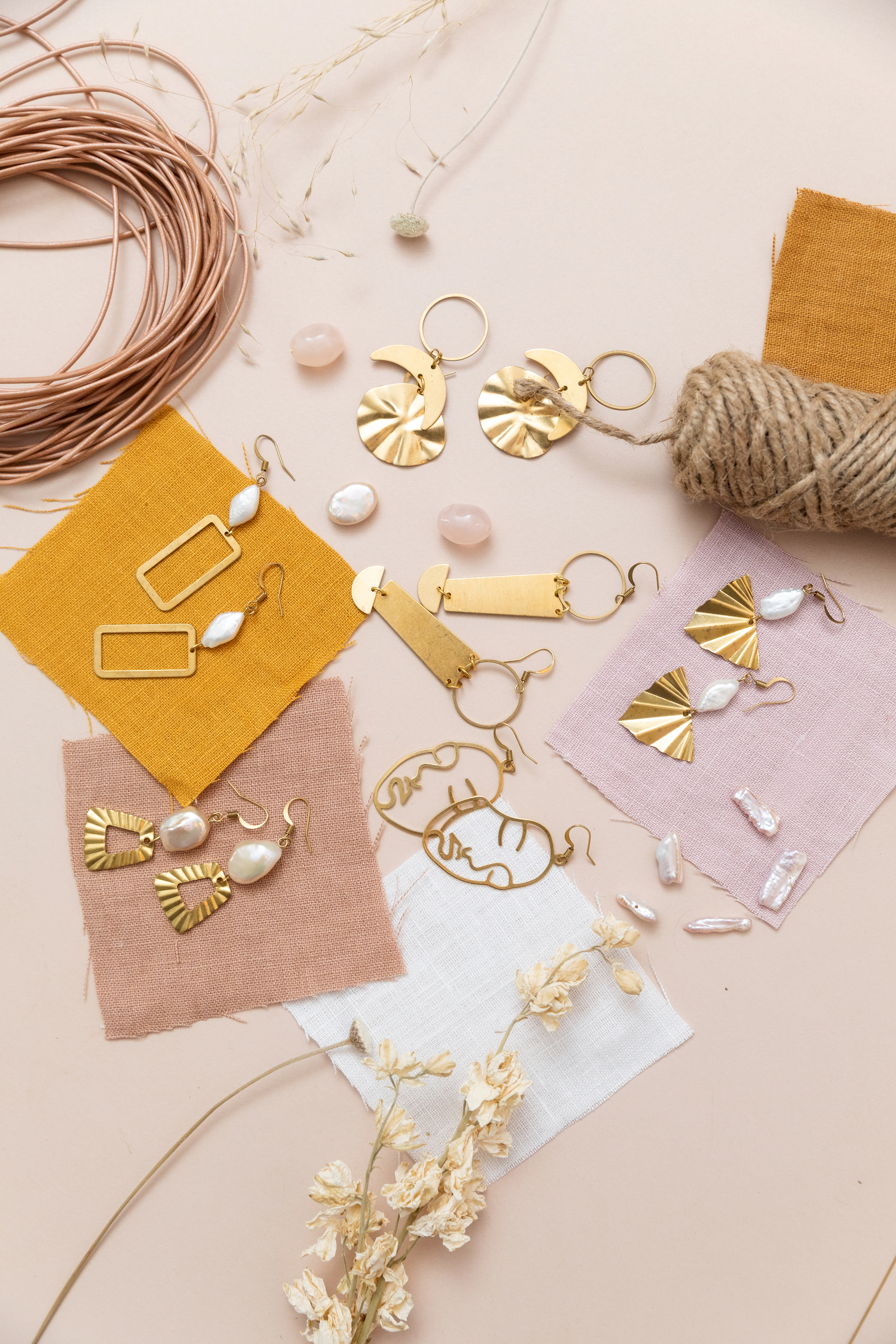 It’s given her more time to make earrings, necklaces and bracelets. Her pieces are at once dainty and statement-making. She pairs small, delicate beads with larger geometric shapes and curvy arches. Her best-seller is the Aliz, a loopy, face-shaped brass earring.
