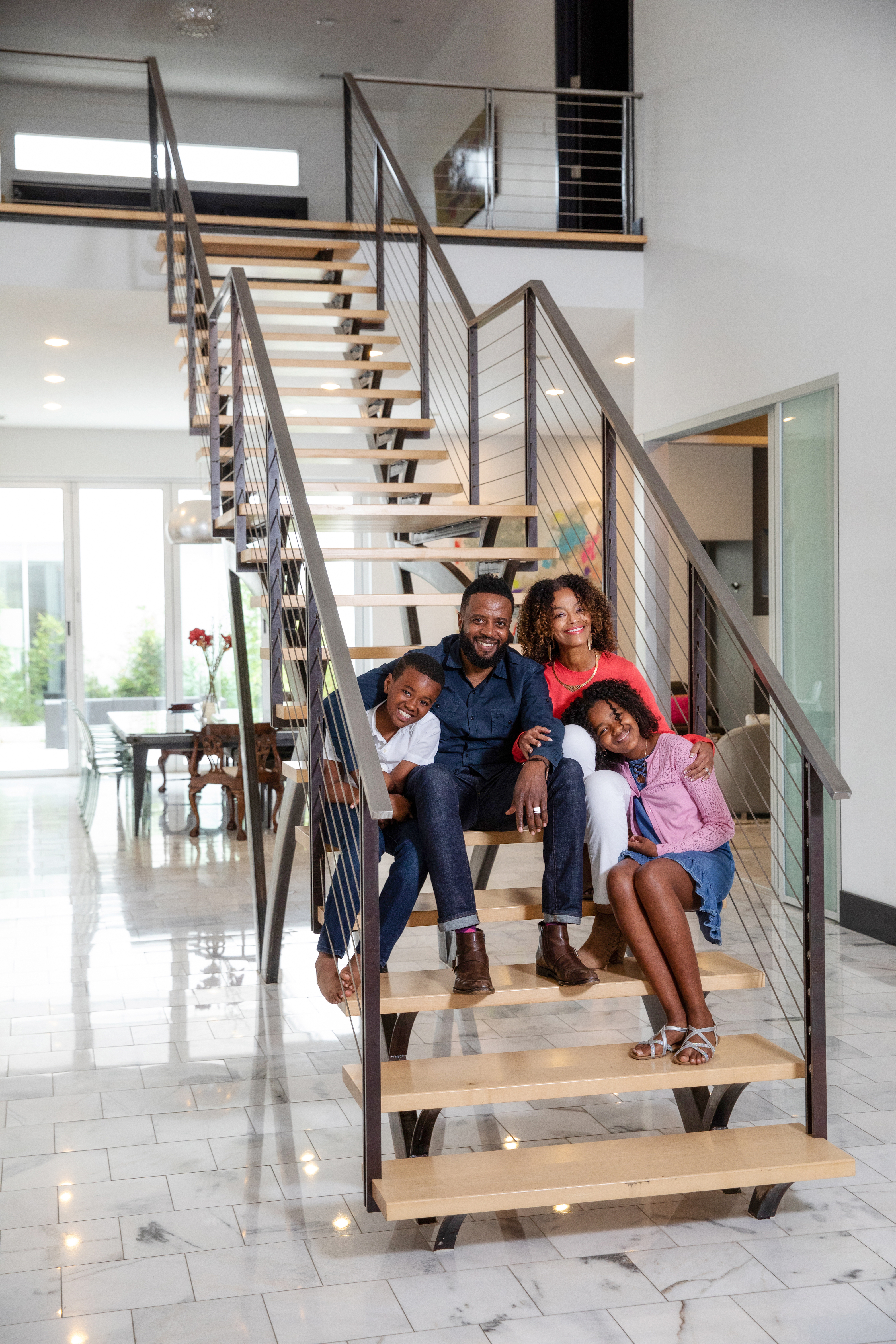 A floating wall separates the entrance from the wide-open spaces of the common areas of the house. Homeowner Leone Elliott drew the stairway and commissioned David Cano with Iron Designs to create it. “From the side, it looks like an exam table,” Elliott says. Photo by ECKO360 / Courtesy Leone Elliott.