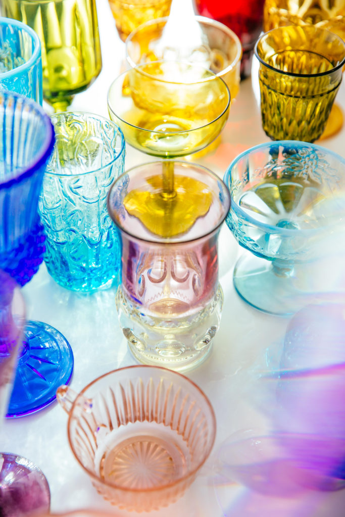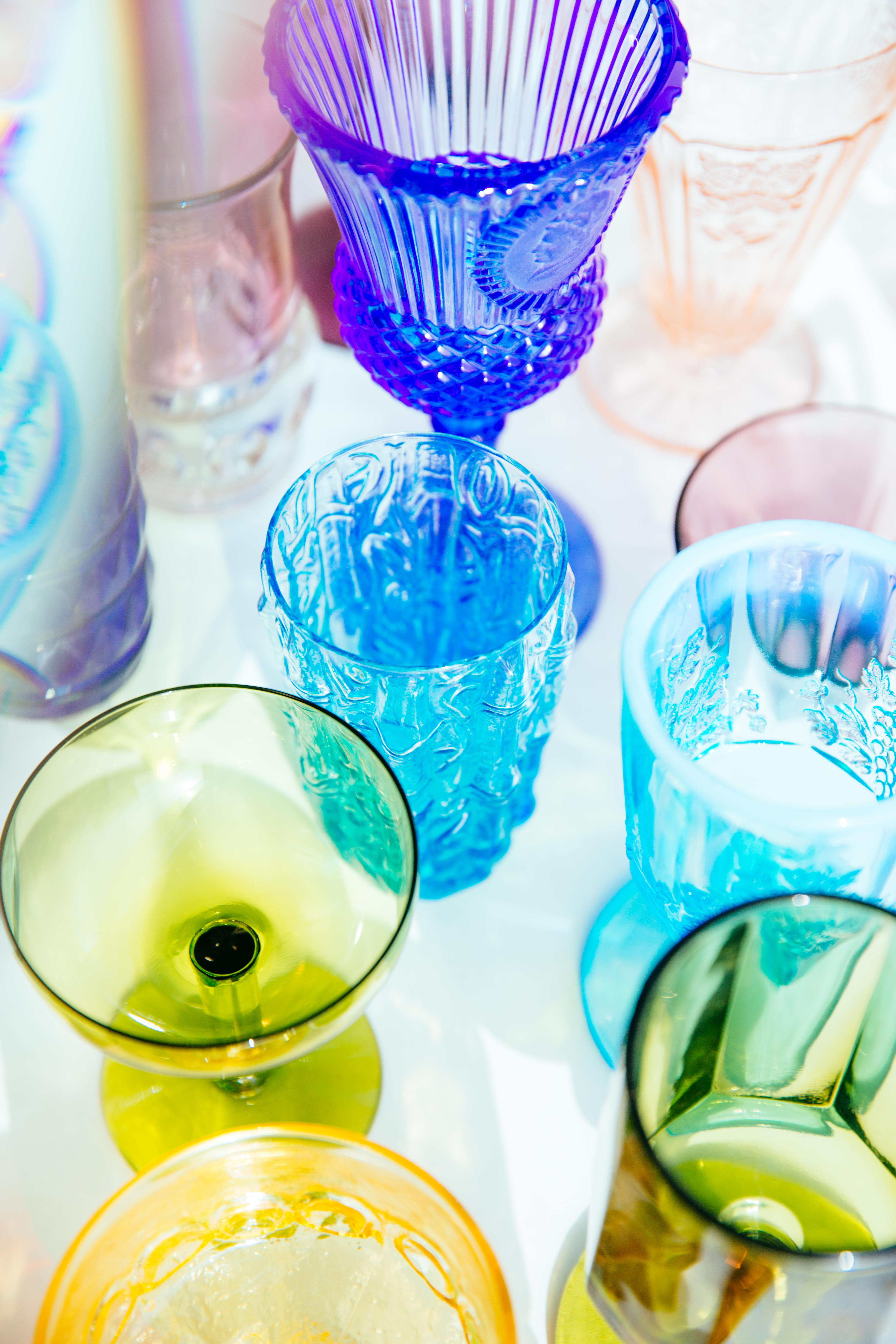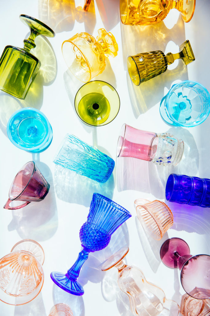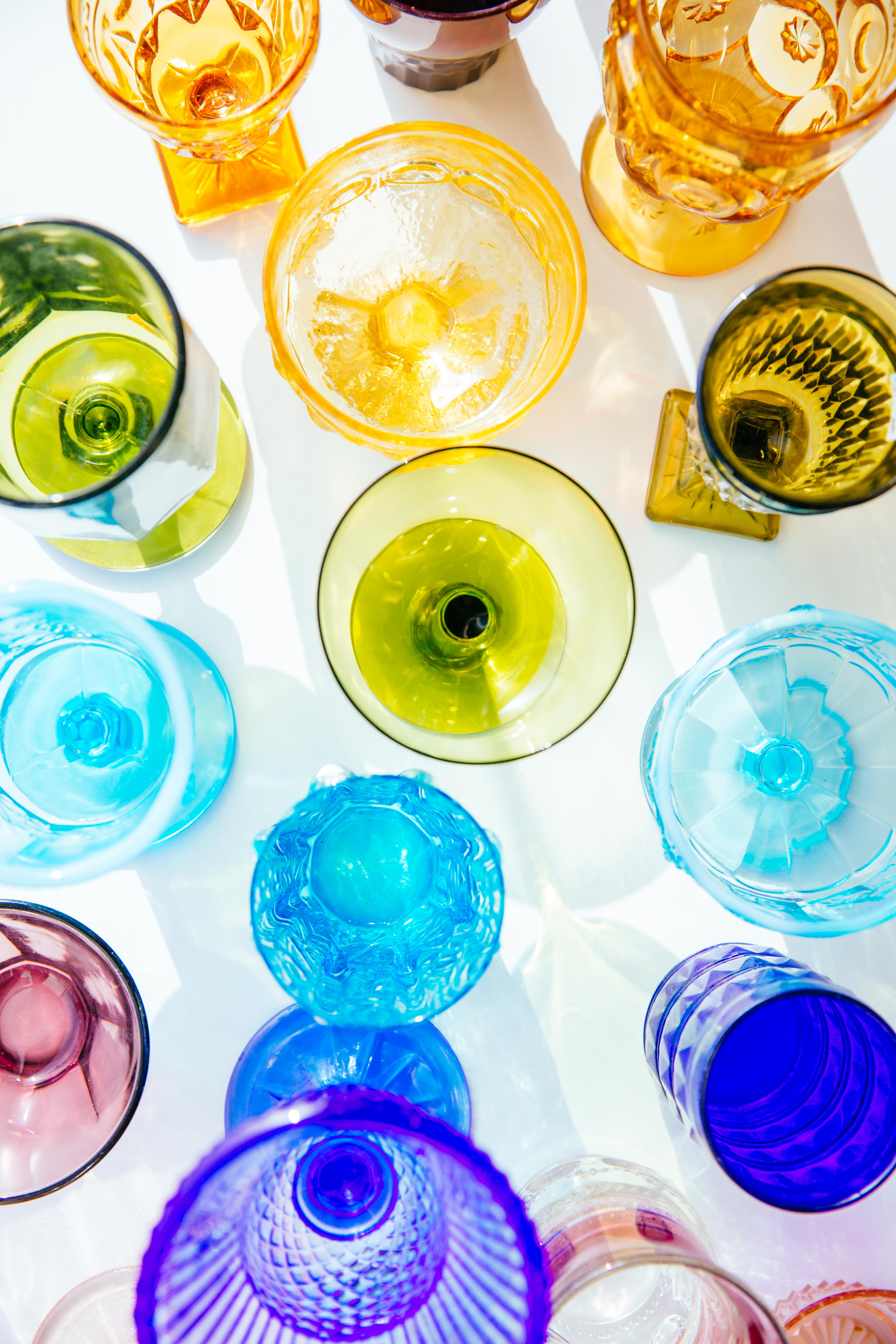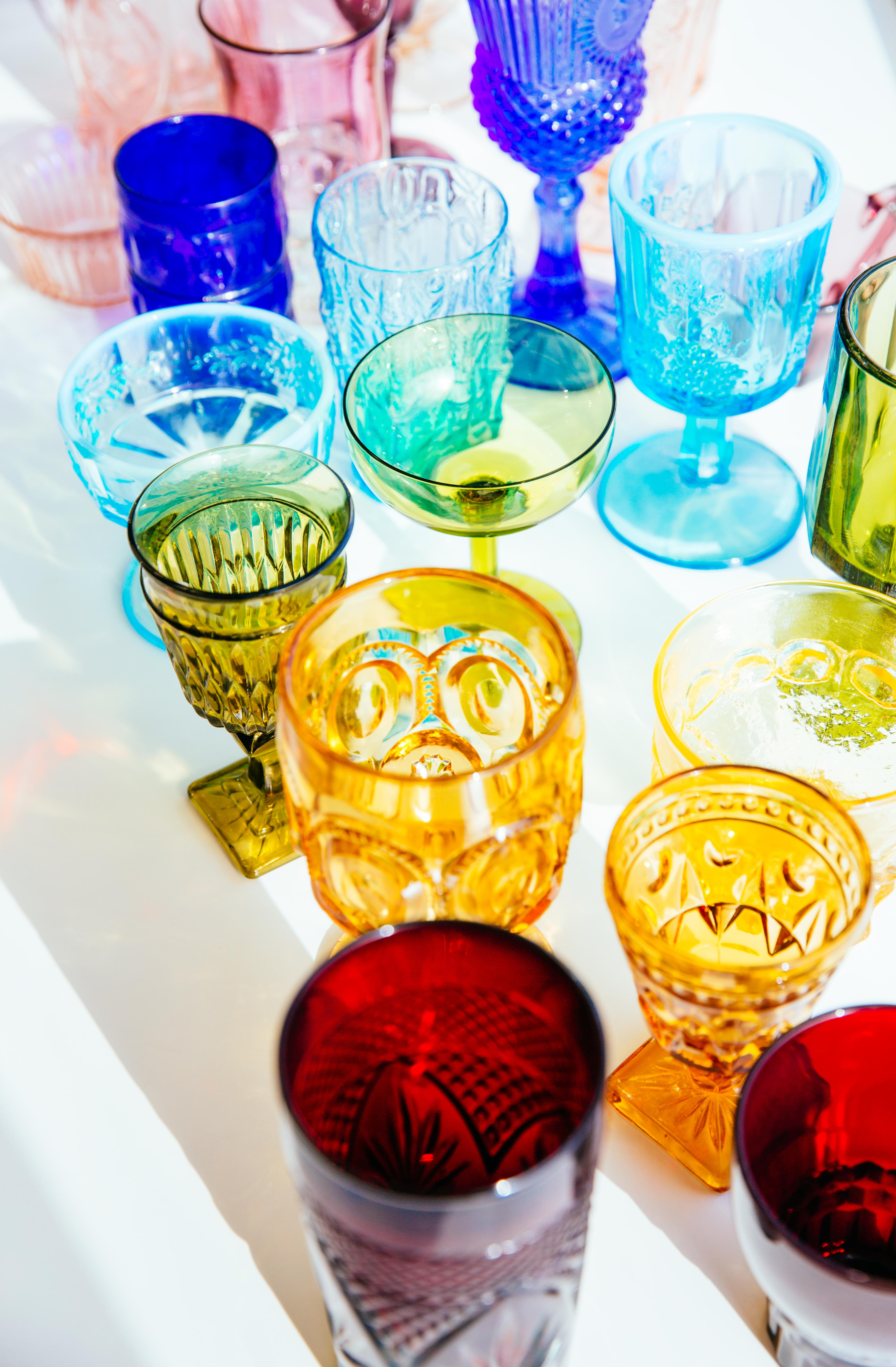 Today, you can find vintage glassware in most local antique shops. Like a scene from your grandmother’s china cabinet, they’re sorted by color, shape and style.
