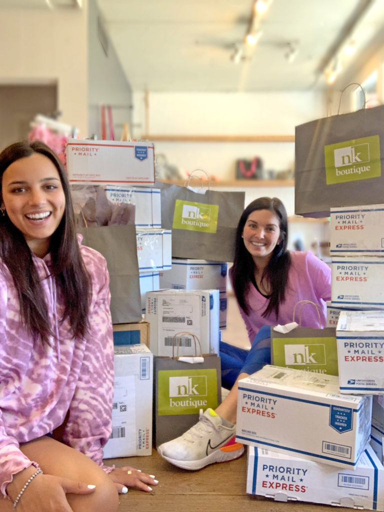 From bags to boxes: NK Boutique staff members Emily Moore and Anna Katherine Gladden set aside the store’s paper shopping bags, instead packaging customer purchases in boxes to be mailed and shipped. Instagram photos also became more important than ever as many stores temporarily shut down physical operations.