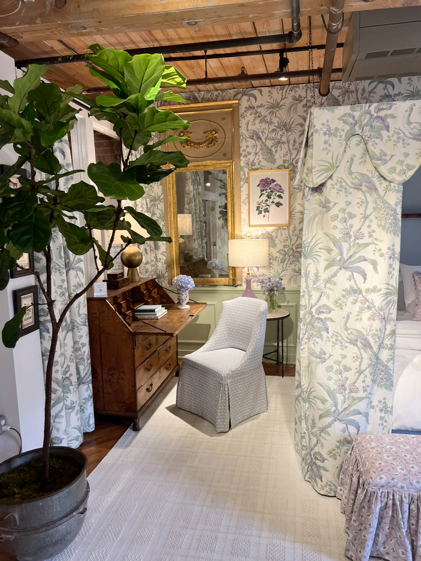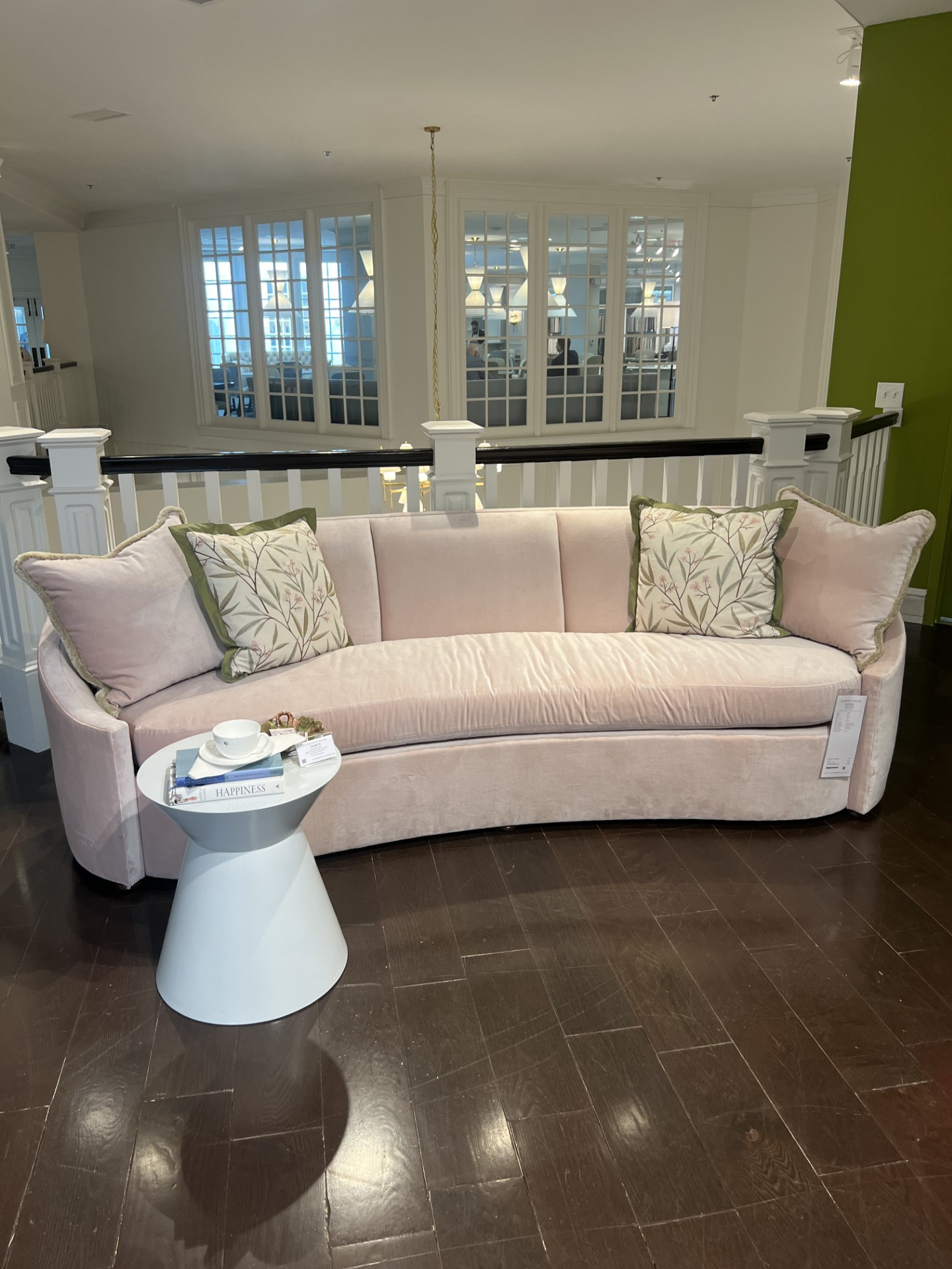 Another thing we loved was the creative use of color. We saw lots of pastel colors like pale pink, sage green, light blue and lavender. Blue has always been popular as it can really be a neutral, in my opinion, but I loved the look of layering different tones of the same color throughout a space. Thoughtful little details like piping and trim are great ways to bring in color if you want your space to read more neutral overall, but still want to incorporate some color. Pastels are a great option for people who want color, but don’t want to go bold. Pastel prints were also popular throughout different showrooms.
