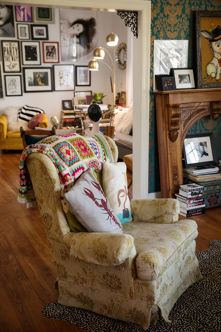 In their bedroom, a metal clothing rack puts their most cherished pieces front and center on display. A ’70s mink coat, floral bomber jackets, a leopard-print coat, gold booties and sassy stilettos: They all add a mix of bright colors and textures to the space.