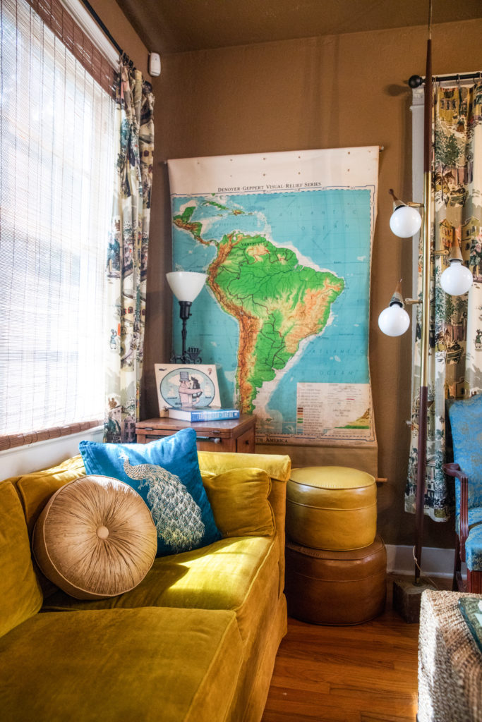 Mooney is quoting a Creedence Clearwater Revival song to poke fun at what Guidry has done to the place. Everything here is one of her thrifty finds, from the Caribbean-patterned curtains and mustard-colored sofa to a giant map of South America. The map is hung on the wall with two screws and a prayer, Guidry says, winking.