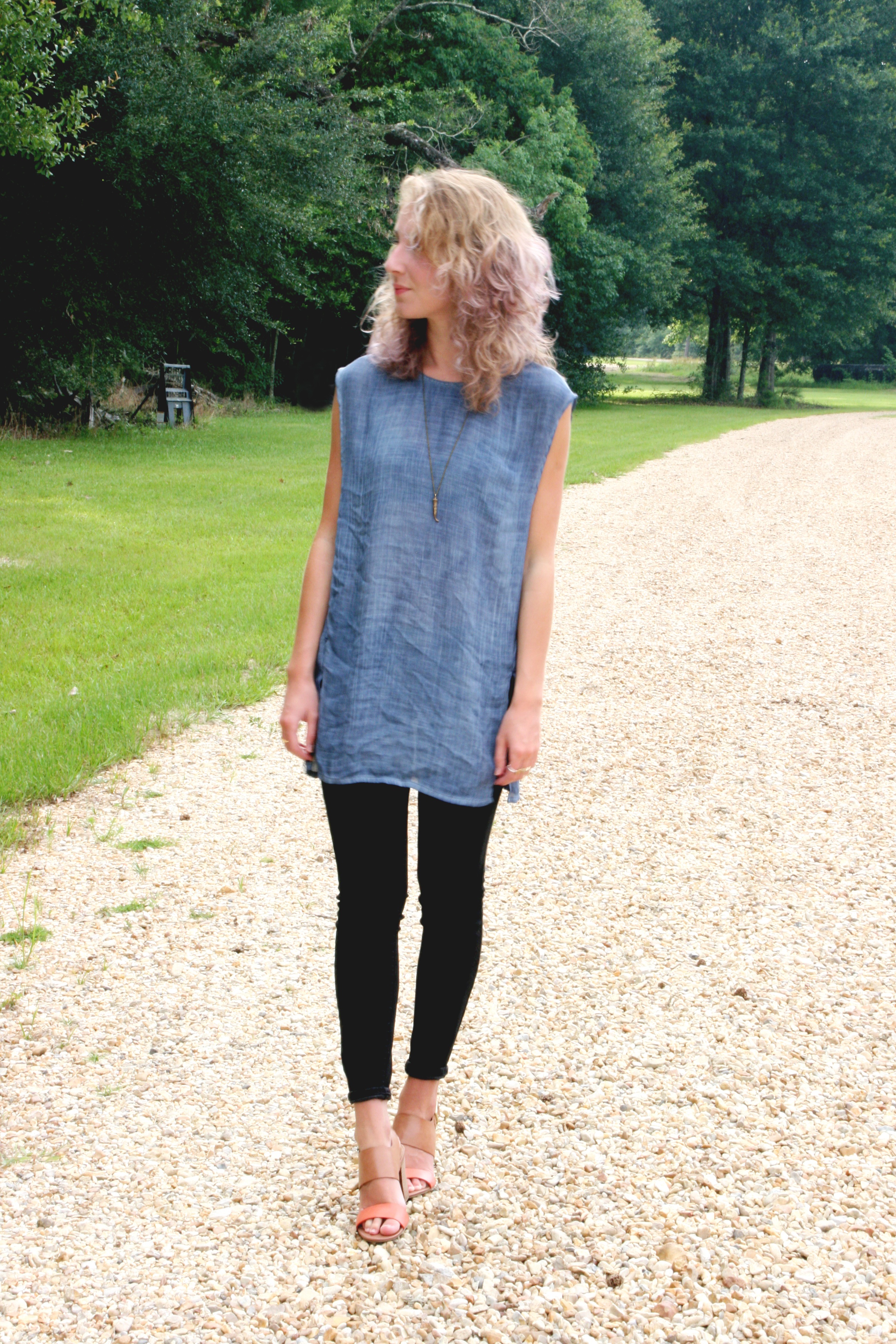 The key to a wardrobe full of neutrals is to play with silhouettes and textures. A linen blend tunic is cool and relaxed with skinny bottoms. The linen fabric is breathable for the heat, and the long hemline makes a streamlined shape. The peek-a-boo sides are a modest take on the cutout trend, but a camisole could be added for more coverage. I love the side slits at the hemline for easy movement. Adding simple jewelry is a must. Anything fussy would ruing the relaxed, cool-girl vibe the rest of the look has going.